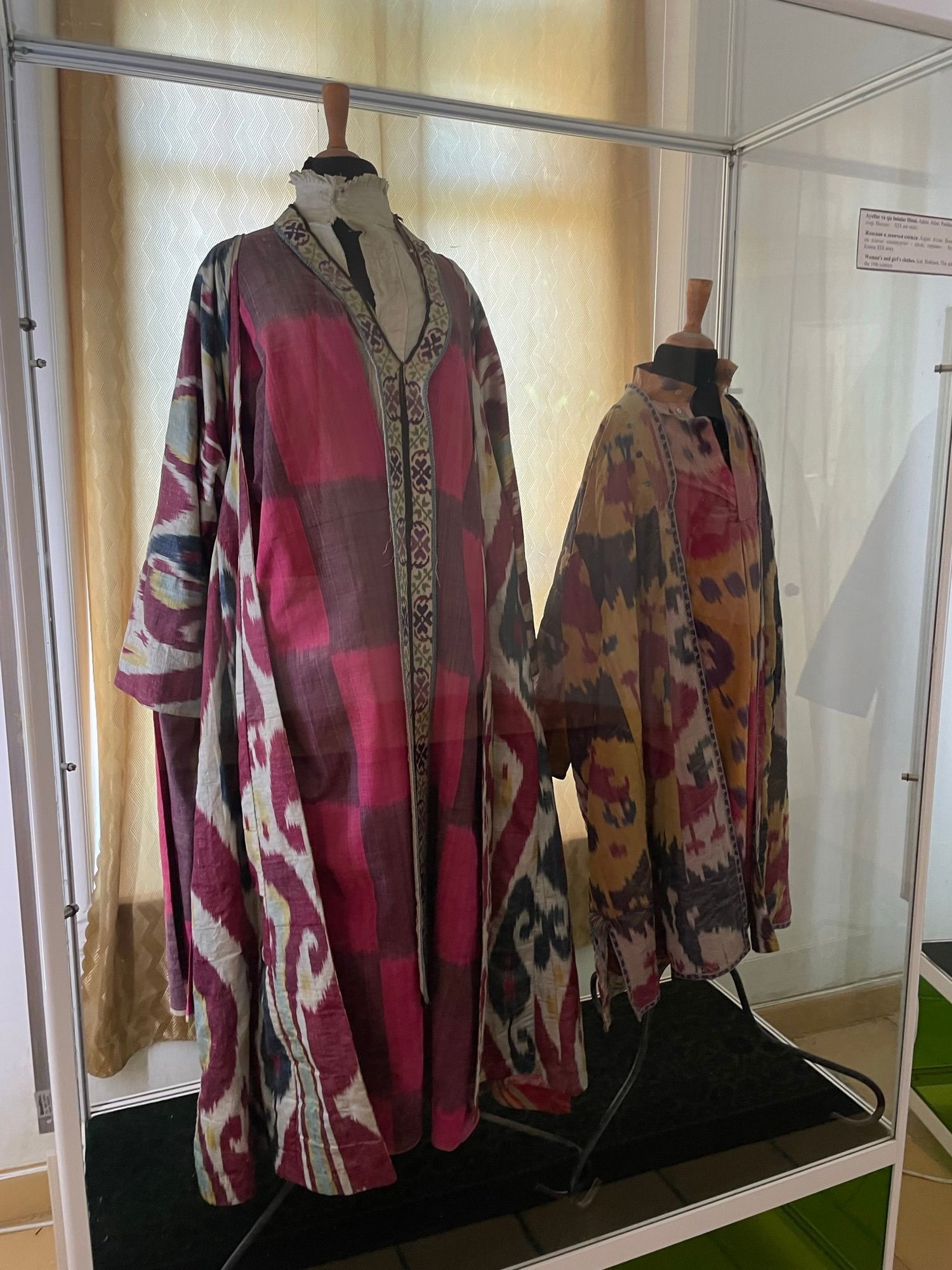 There are many displays of traditional clothing, carpets, china, and more
