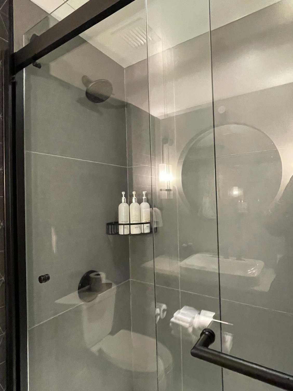 Tiny bathroom with walk-in shower.
