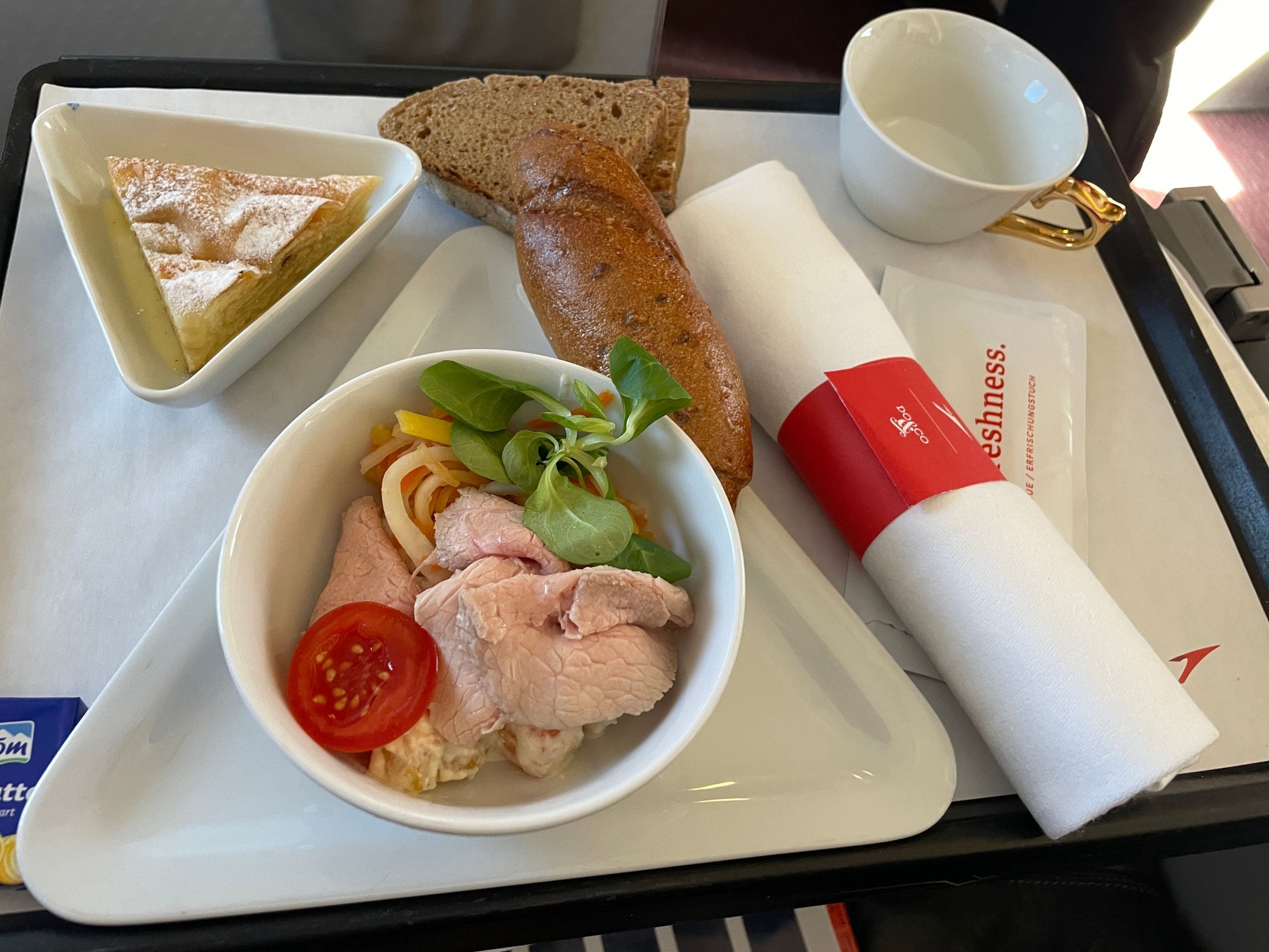 FLR-VIE, light meal on a 1-hour flight. There were some vegetables hidden under the meat.