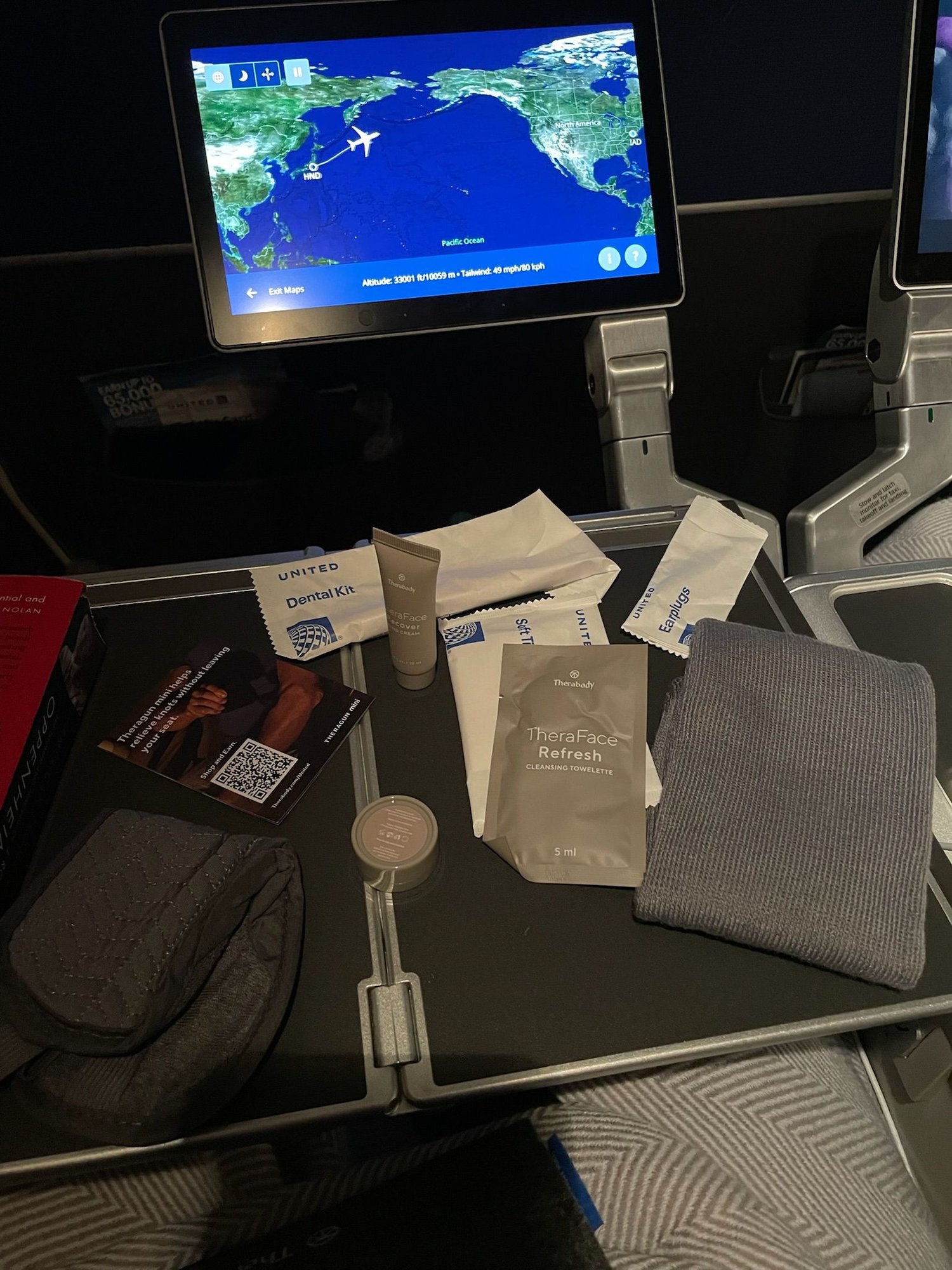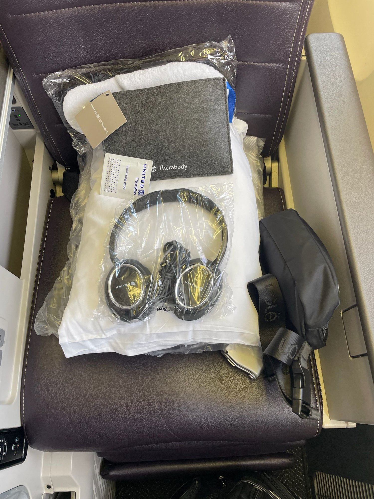 A nice array of goodies were at the seat waiting for us. Hope this captures the width of the seat, in line with some reverse herringbone business class seats.