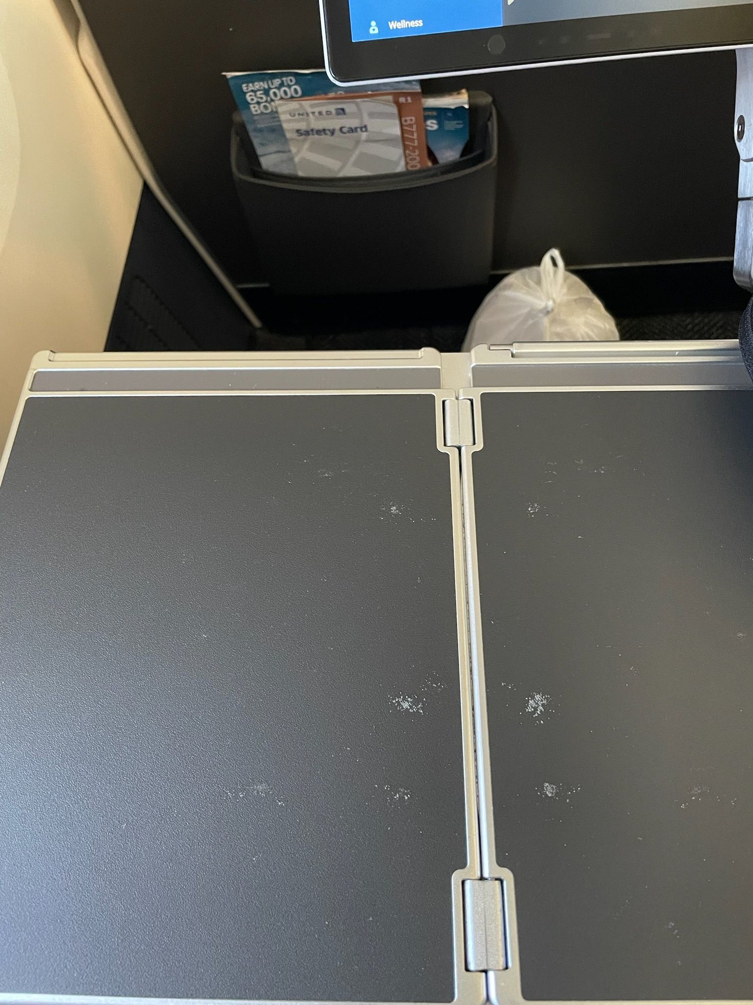 The plane was very clean, as expected, although my tray table did have some gunk on it that I used the alcohol wipe they pass out during boarding to clean.