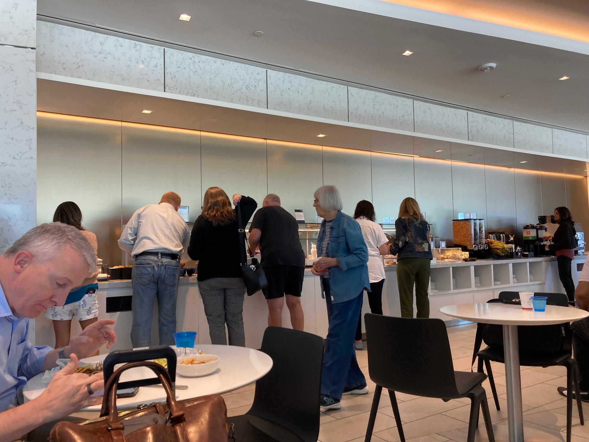 The lounge has a departures board but no calls are being made, except the call that people should offer their extra seats as the lounge was getting at capacity