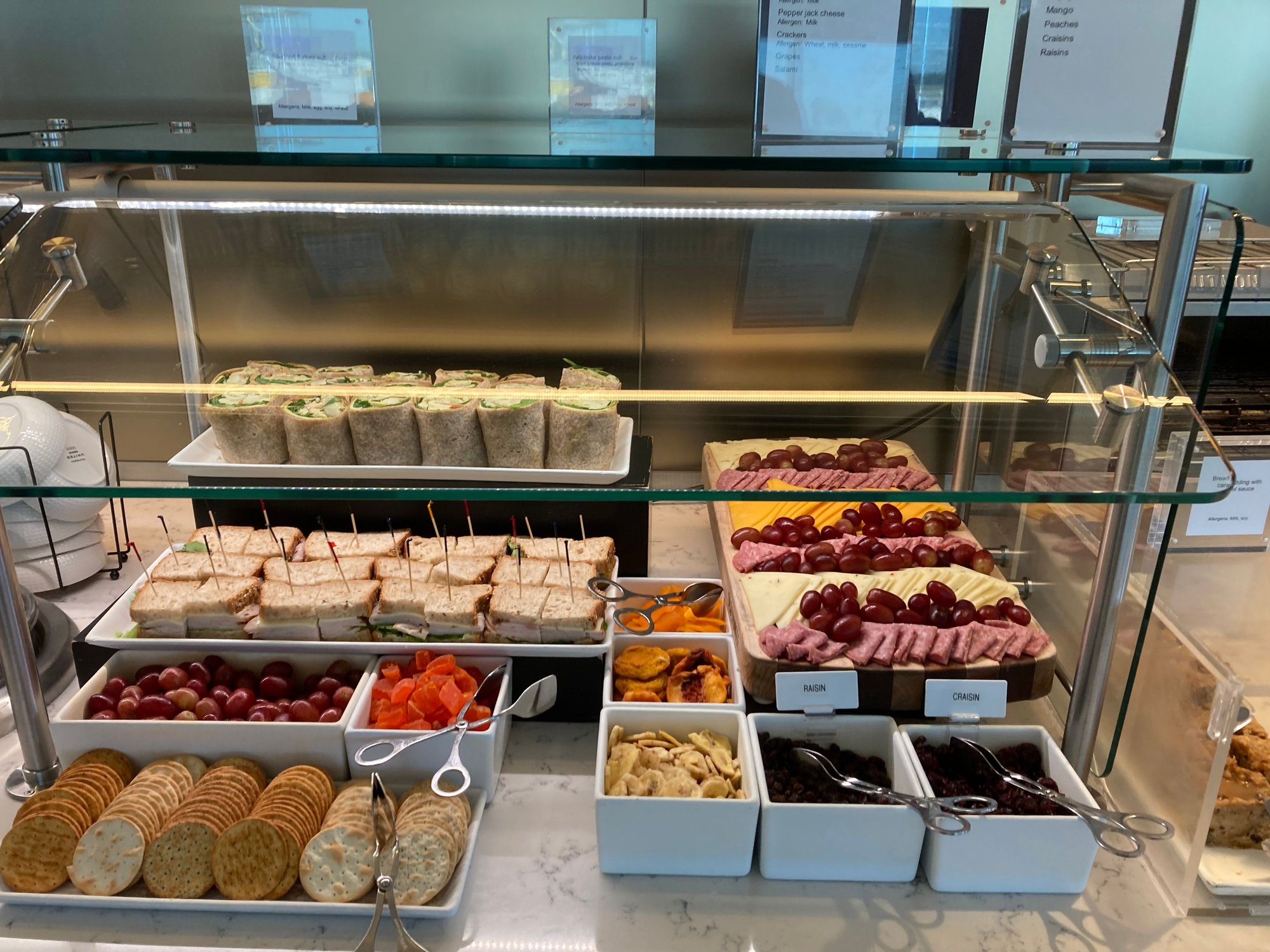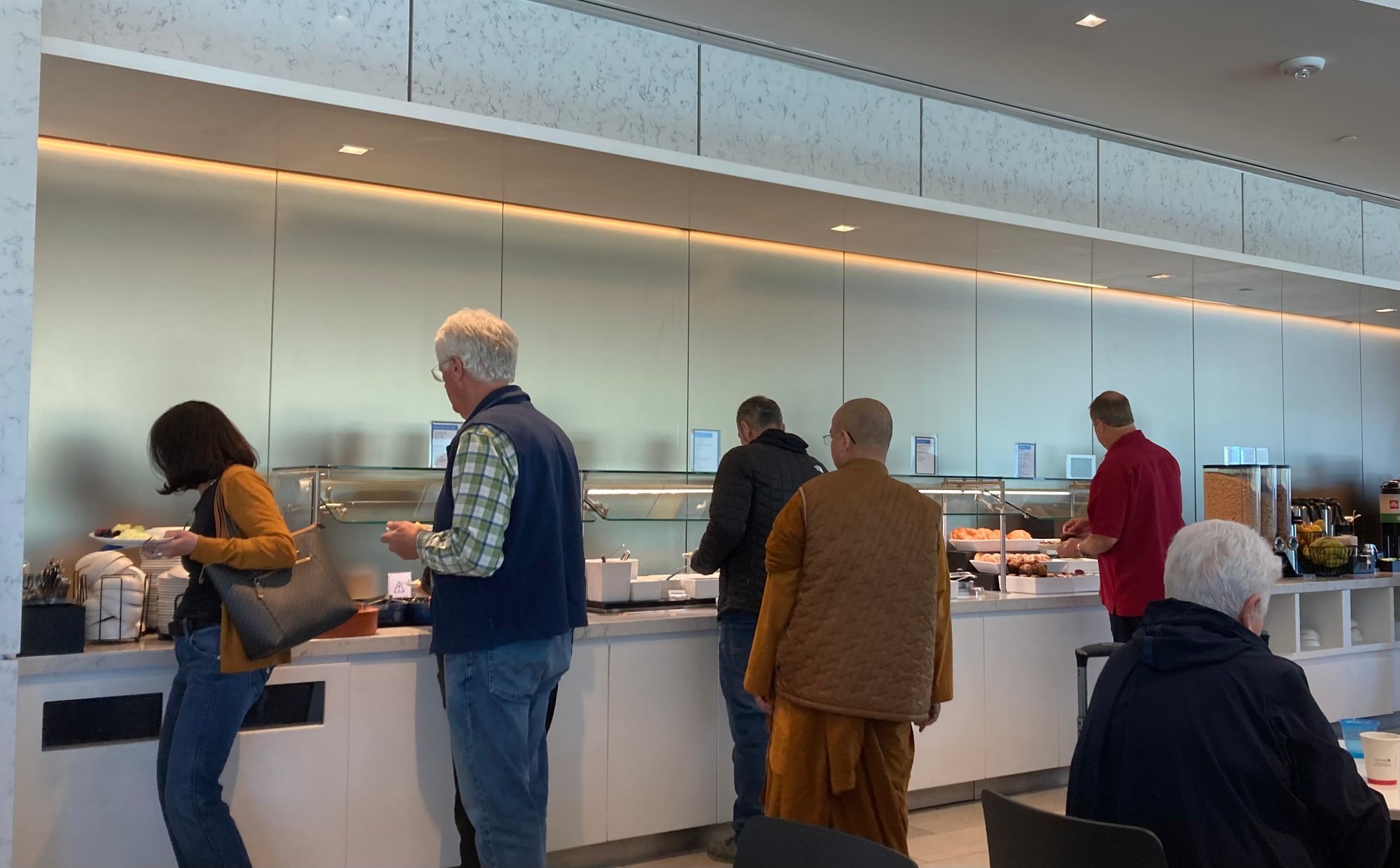Staff is holding back guests and asking them to queue up so that the UA Club kitchen staff can remove old items from the buffet and set up the new offerings.