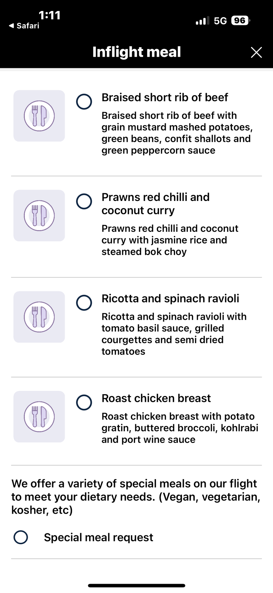 Pre-order for CDG-EWR this coming weekend. Beef for me again.
