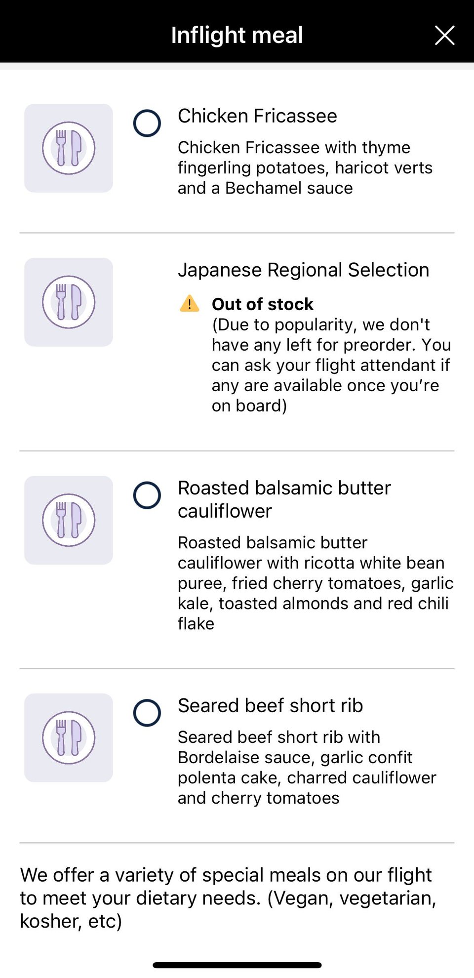 I have the same menu to preorder for SFO - HND this week. I’m going with the cauliflower, unless the beef is incredible.