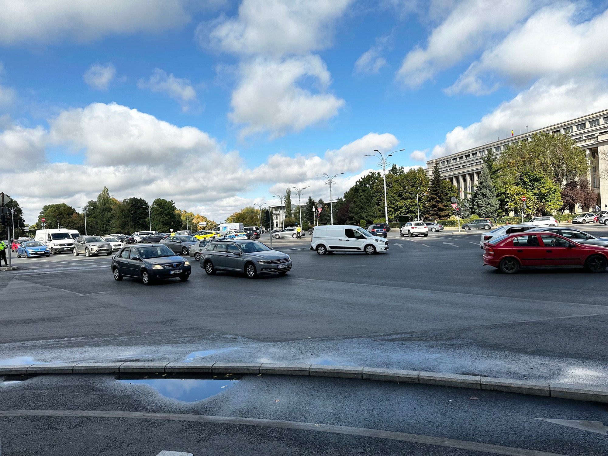 Crazy enormouse road junction, goes all the way back to the trees. At least 20 lanes join the huge expanse and it always has a few carloads of whistle happy police managing it