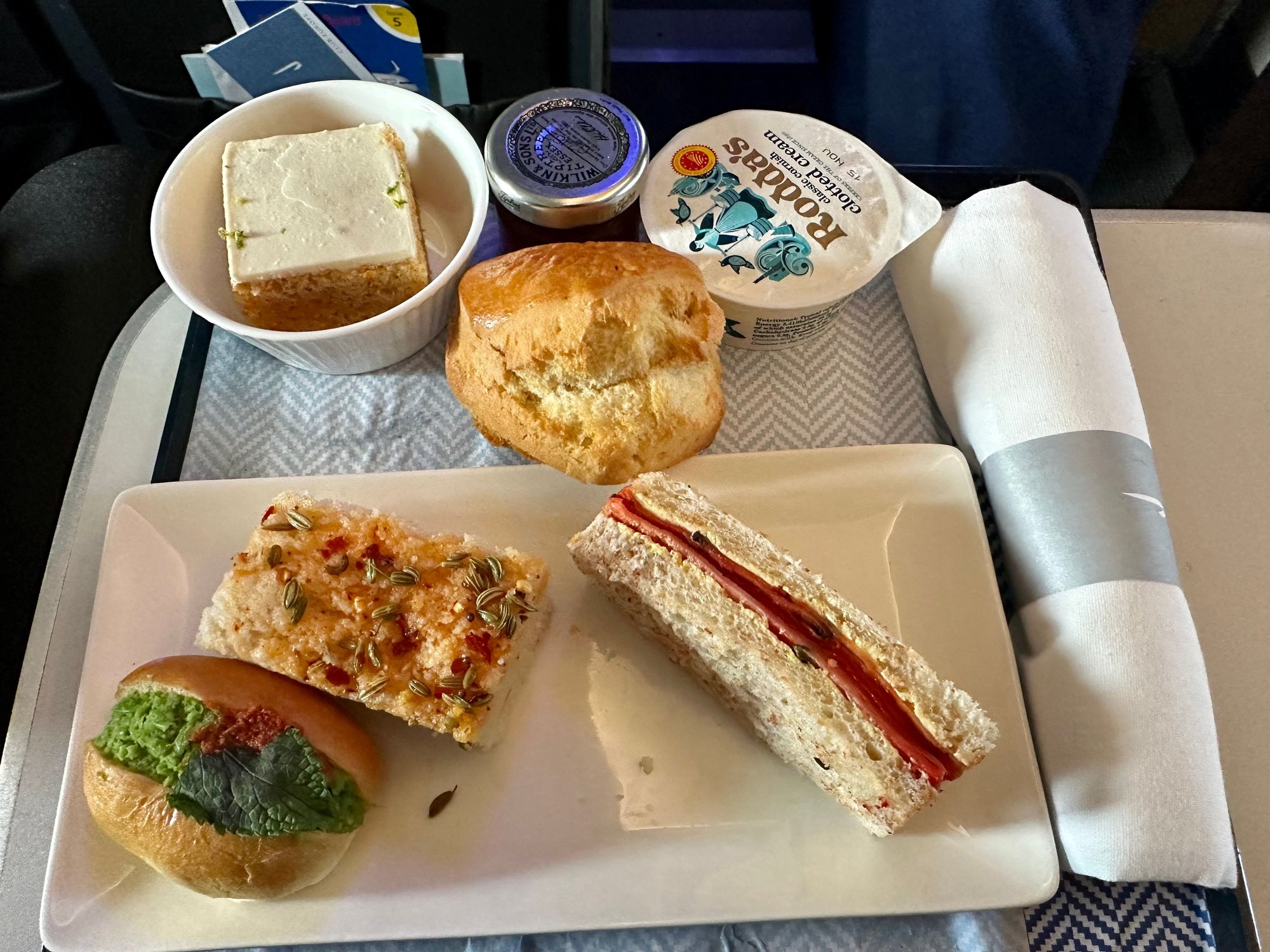We were about 20 minutes late taking off and the very experienced crew knew exactly what they were doing with service being quick and efficient. I’d ordered the Muslim meal for this leg and it was very interesting. A sandwich with what appeared to be thinly sliced aubergine was not for me, a roll with a coriander something or other was very refreshing, and the large white lord knows what with a topping of seeds and chilli was very good, and hot. Did I say that it was spicy, very SPICY! Thoroughly enjoyed it.