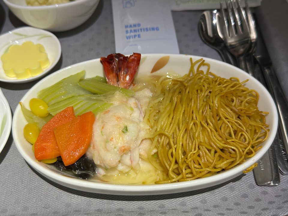 Shrimp Coated with Shrimp Mousse in Superior Sauce Served with Assorted Vegetables and Cantonese Fried Noodle (415 kcal)