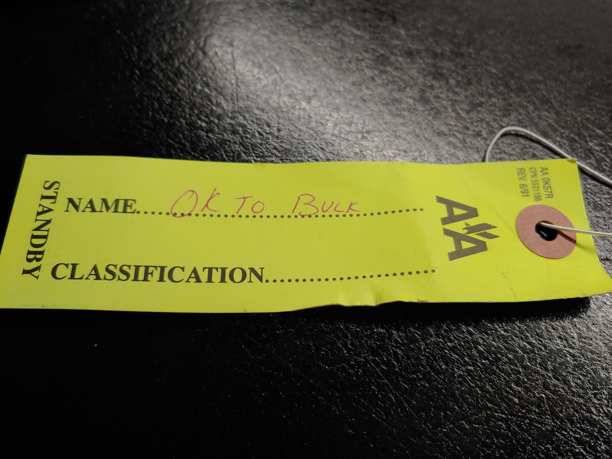 The tag had 'Name' and 'Classification' blanks on it. The 'Classification' field was left blank, but the 'Name' field did not have my name in it, only the words "OK to bulk."