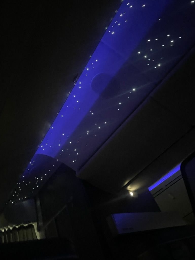 Back at my seat, now with mattress pad attached, I got ready for bed. The ceiling of EVA's 787-10 is covered with small holes that can be lit up to act as stars. Wow.