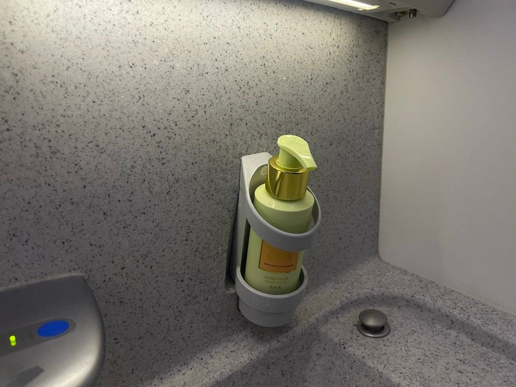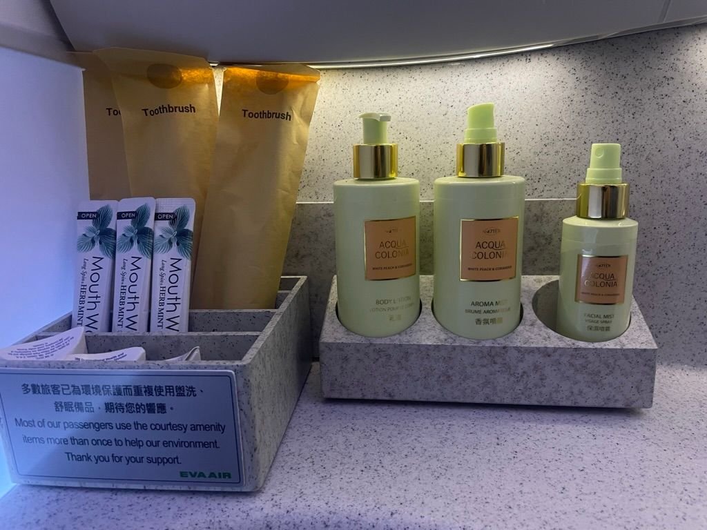 The lavatories on the 787-10 are relatively large (albeit not as large as on the 777-300ER) which is good when you need to change. In addition to the toothbrush and toothpaste provided in the amenity kit EVA provides toothbrushes, toothpaste, and earplugs (I think?) in all of the business lavatories.