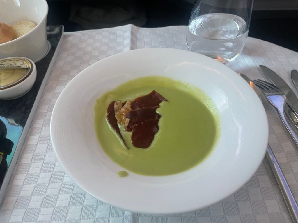 The next dish is one that sets EVA apart from most other airlines’ business class—the soup course. Usually, soup is reserved for first class, but that is not the case with EVA. The caramelized pea soup with crispy prosciutto was served at a good temperature—warm but not scolding hot—and was very flavorful. They also brought around a variety of different breads at this point.