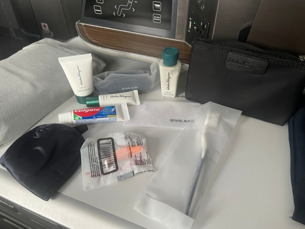 I feel like now is a good time to discuss the numerous amenities that were distributed at the beginning of the flight. Not only does EVA provide an amenity kit on their long haul flights, but they also provide slippers and pajamas.