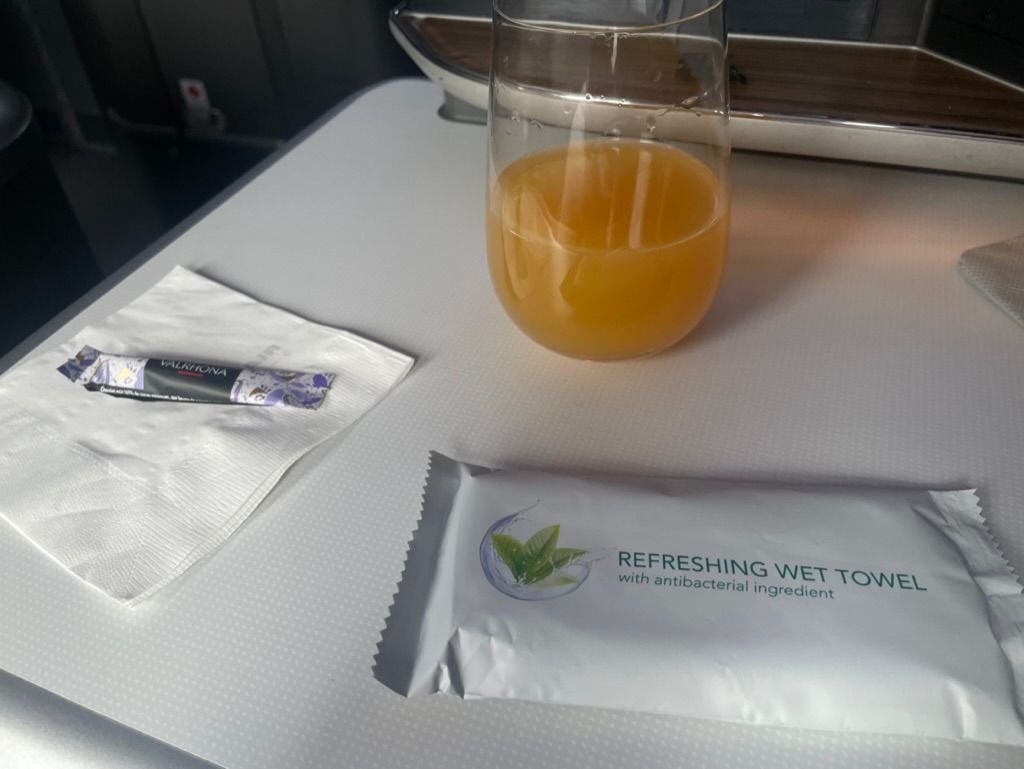 Service started just before takeoff with my pre-departure beverage of choice, orange juice, along with a chocolate, and wet towel (I think I might have gotten upwards of 4 or 5 of these by the end of the flight).