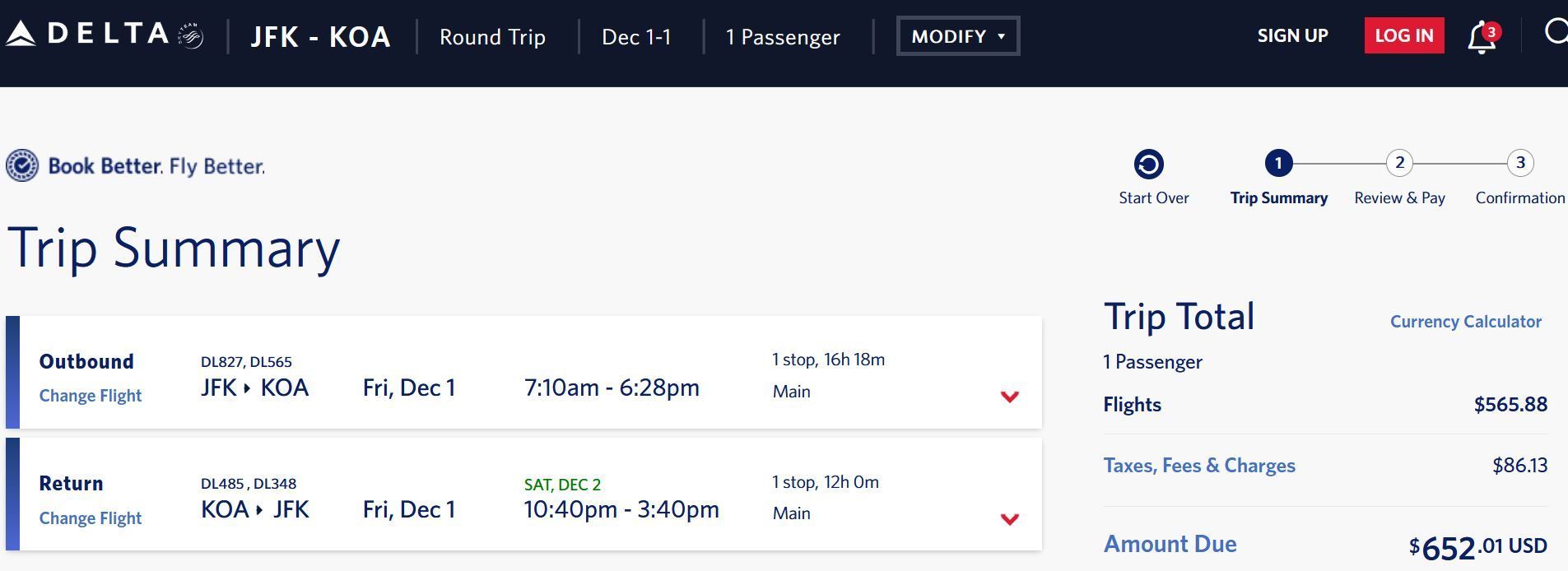 e.g. Dec 1, JFK-SEA-KOA-SEA-JFK, $652 (MC), 4 hours in Kona, arrive back in NYC afternoon of Dec 2, price available for departures from Dec 1 - 11