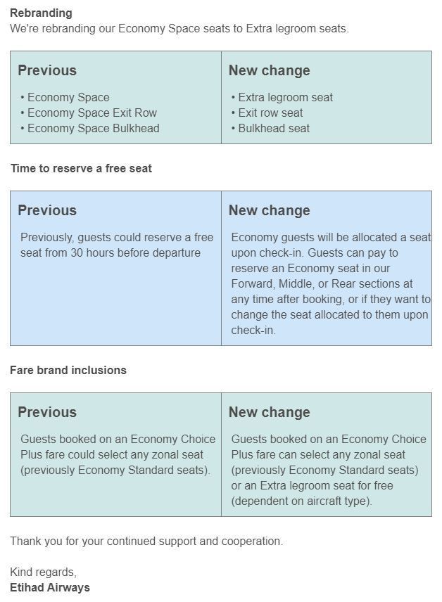 Just seen an updated email, looks like you will be allocated a seat for free at check-in. But if you want to change it or select in advance it will cost. I'm sure middle and forward zones will cost more than rear. Etihad Guest members silver and above should still get the free/discounted seat selection.