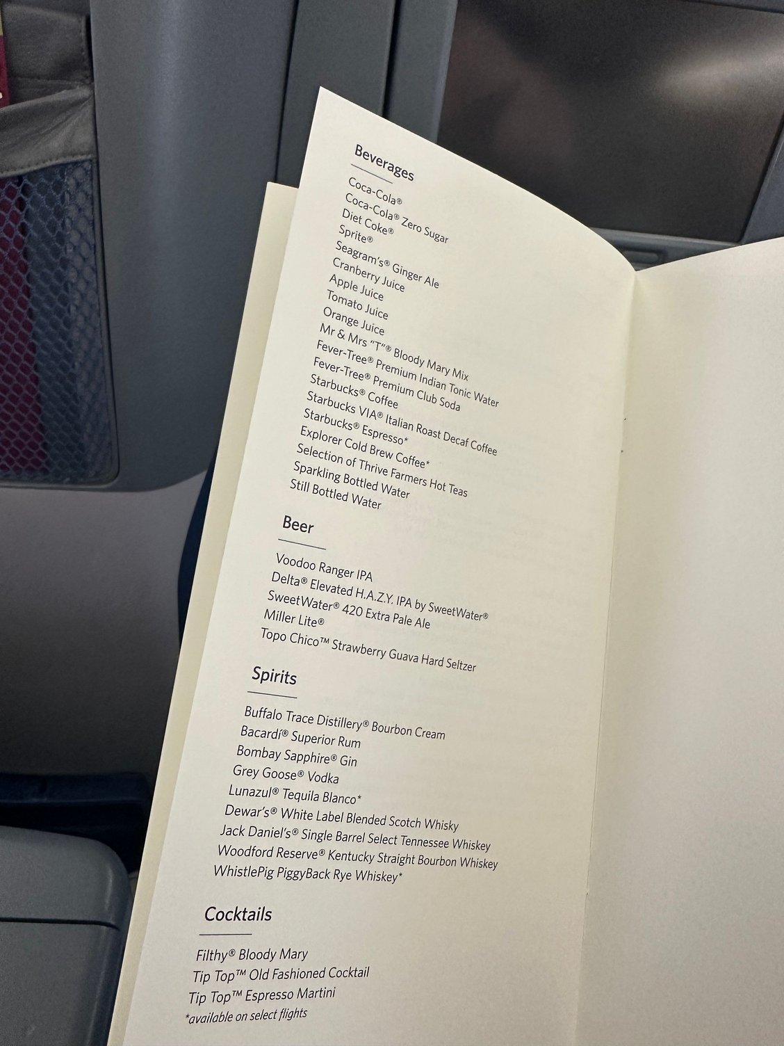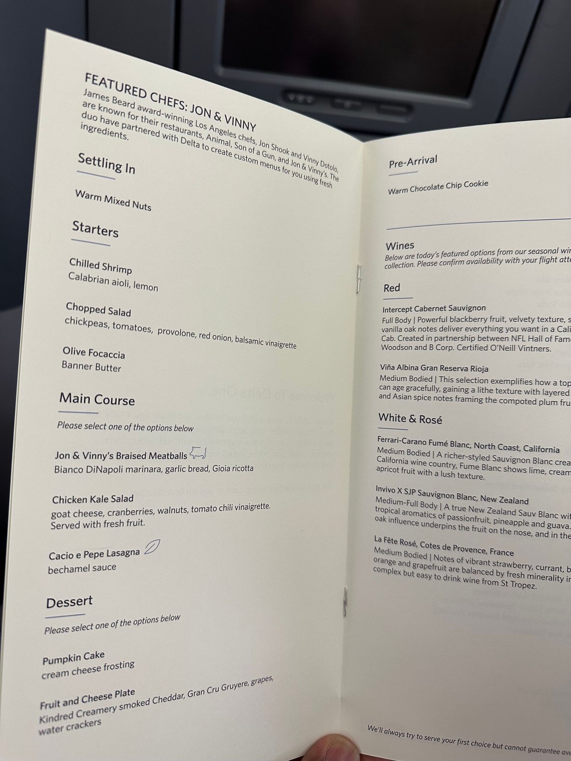 At least on the domestic front, D1 service seems to be back to pre-Covid levels. This is a change from earlier this year. Printed menu on today’s LAX to JFK is below. The service is phased, with warm nuts, entree, and desert offered. Selections of wine (while still mediocre) are better than they were a year ago. Flight attendants seem to be better trained.