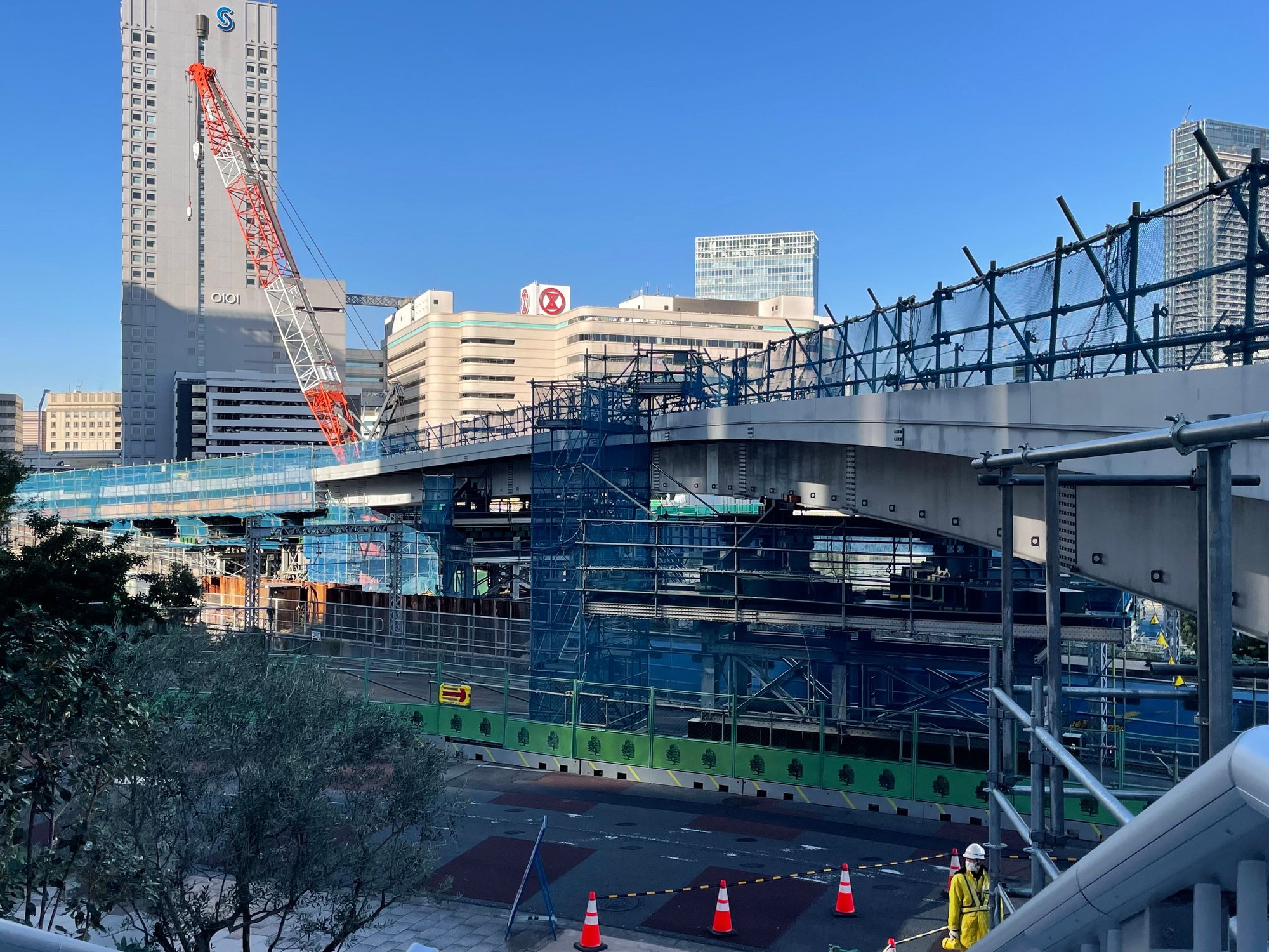 The pedestrian bridge being constructed seen from the Music Terrace. The building with a red logo in the centre is Sogo Department Store and the JR station is on the other side of Sogo.