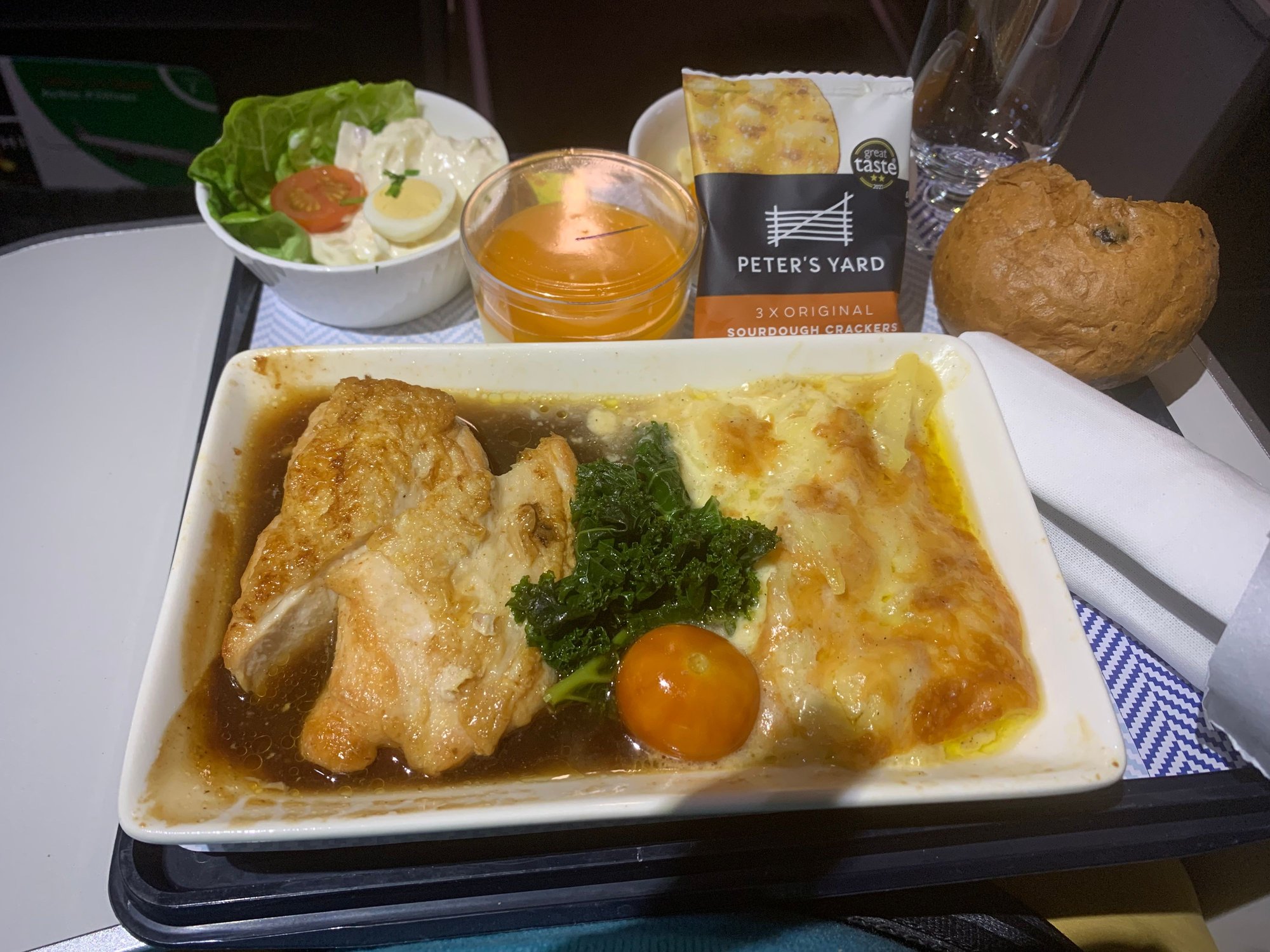 Thus as soon as were airborne they served what by now (14.30) was a late lunch. Menus had been handed out on the ground. We went for the chicken which was delicious as usual. It was not the day for a beef salad being -6°C outside. I enjoyed the potato salad and the quail (?)’s egg. As always we swapped desserts for cheese. The Champagne was plentiful and the red wine was perfectly adequate. All in all an enjoyable flight even though our connections were gone and we knew that we would be at Heathrow that night.