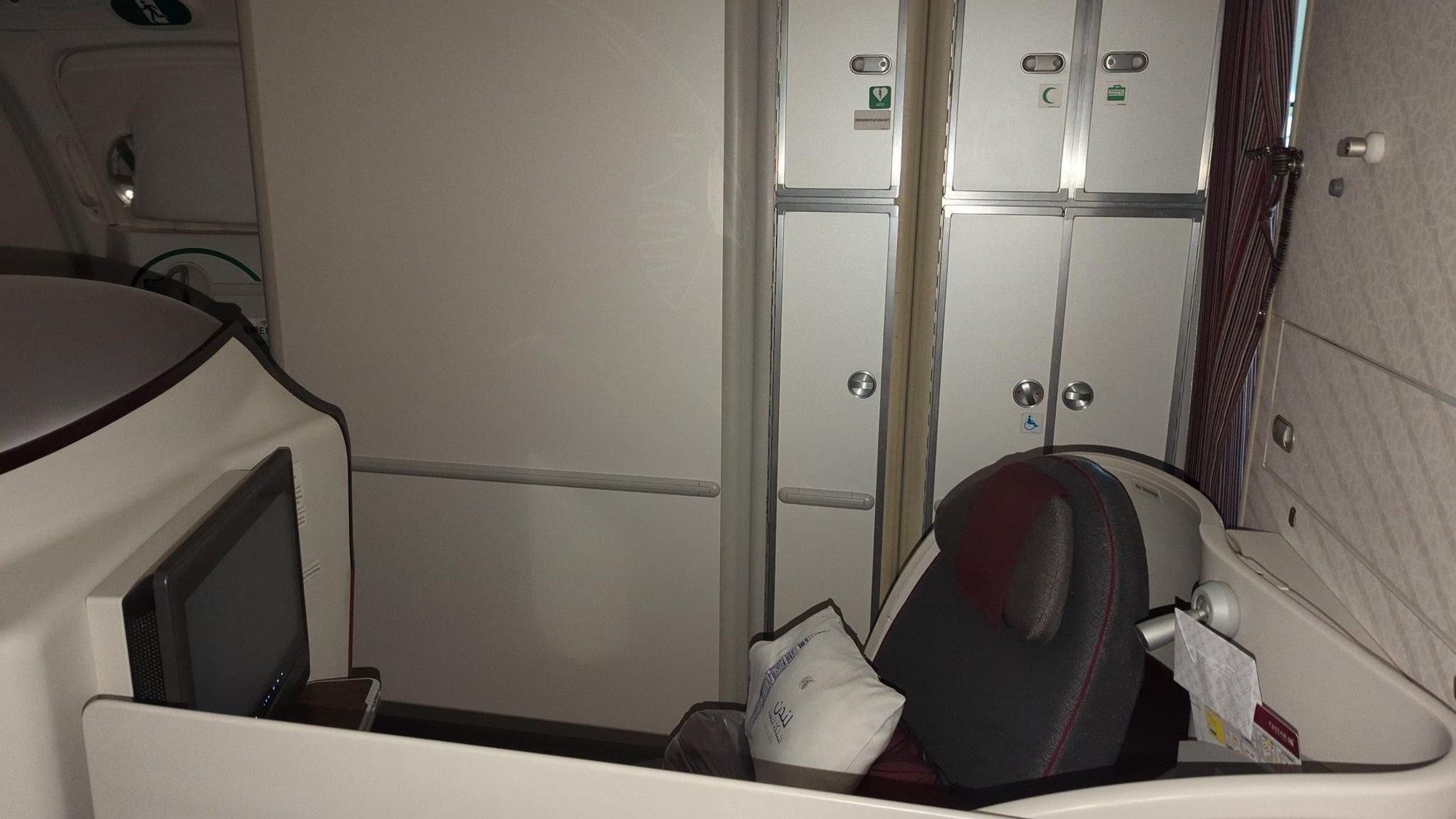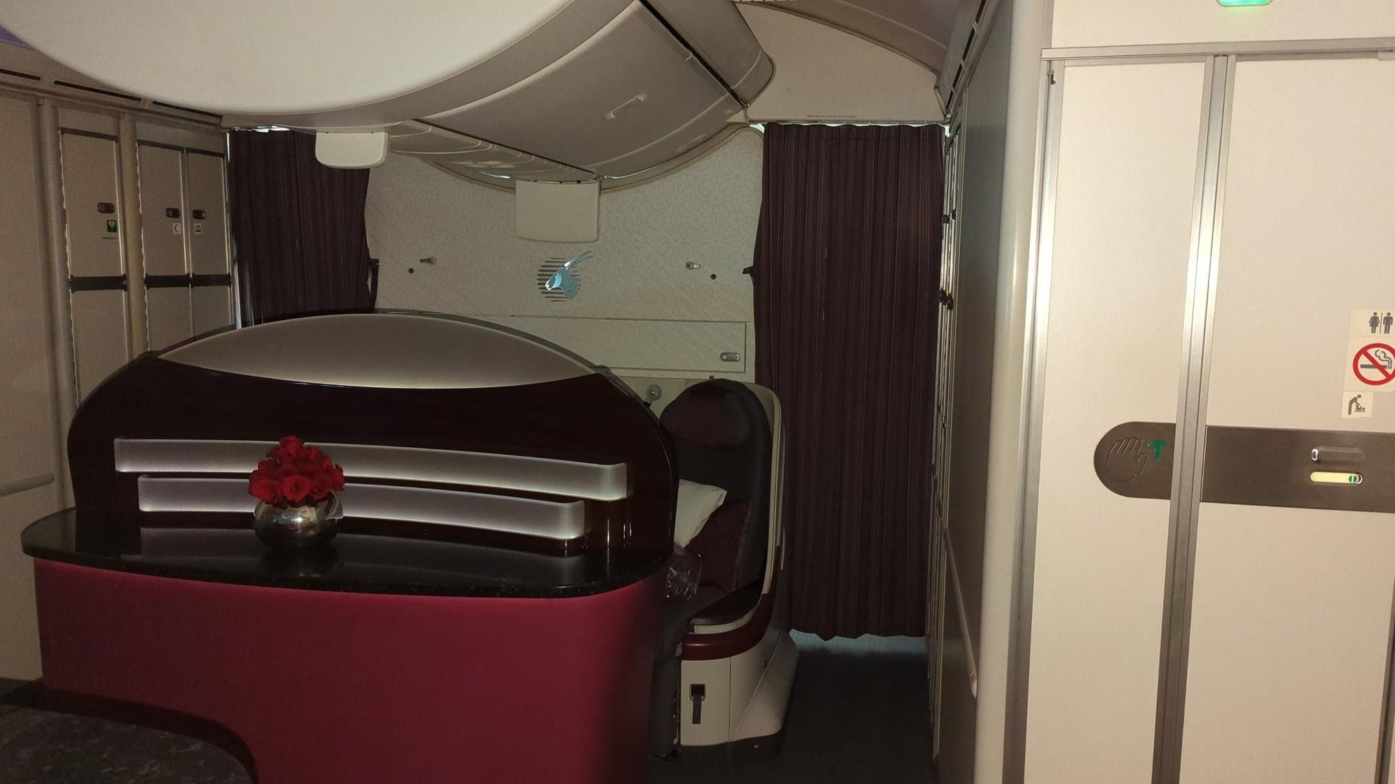 If you're unlucky though you might have noise from Economy behind the curtain, bassinet and all. So I would probably not select these but it would not be the end of the world having to sit there either. The toilet doors are not facing the seats.