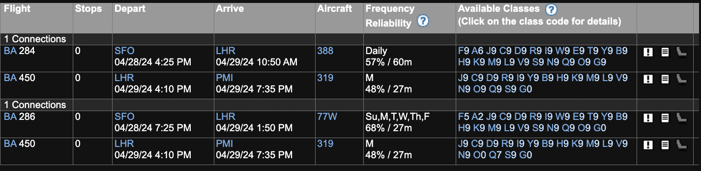 ANN4C8S4` and `ANN6C1S4`. However, matrix only shows `ANN6C1S4` as open on BA284. For the evening flight the booking engine only offers me `F1N0C9S0` which is about US$5000 more. This is despite showing A availability on LHR-JFK/SFO-LHR, and the connecting flight to PMI being the same in both cases. Availability/pricing on matrix agrees with google flights/BA multi-city search as well.