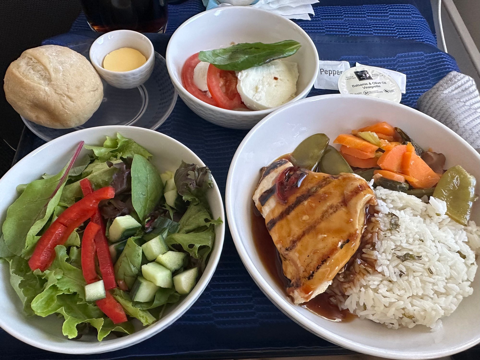SYD-SFO Dec 16 12:10pm departure. Went with the buffalo mozzarella appetizer and grilled ginger chicken breast entree. Overall pretty decent! I haven't had the sundae ex-US in a while but this one departing Sydney was very good. Just soft enough to eat and a solid serving size, plus the usual toppings.