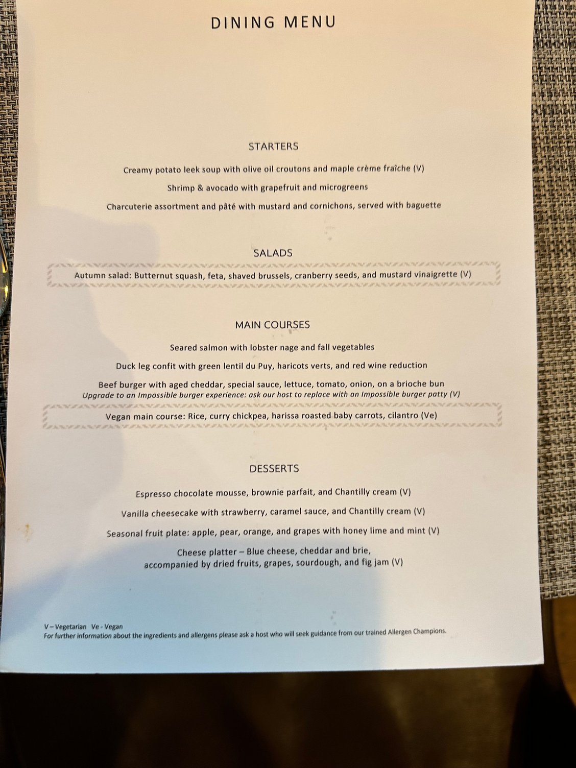 Unfortunately due to the holidays most things were out of stock and it was basically charcuterie followed by salmon which I declined. Probably a good thing as I’m not at all hungry yet.