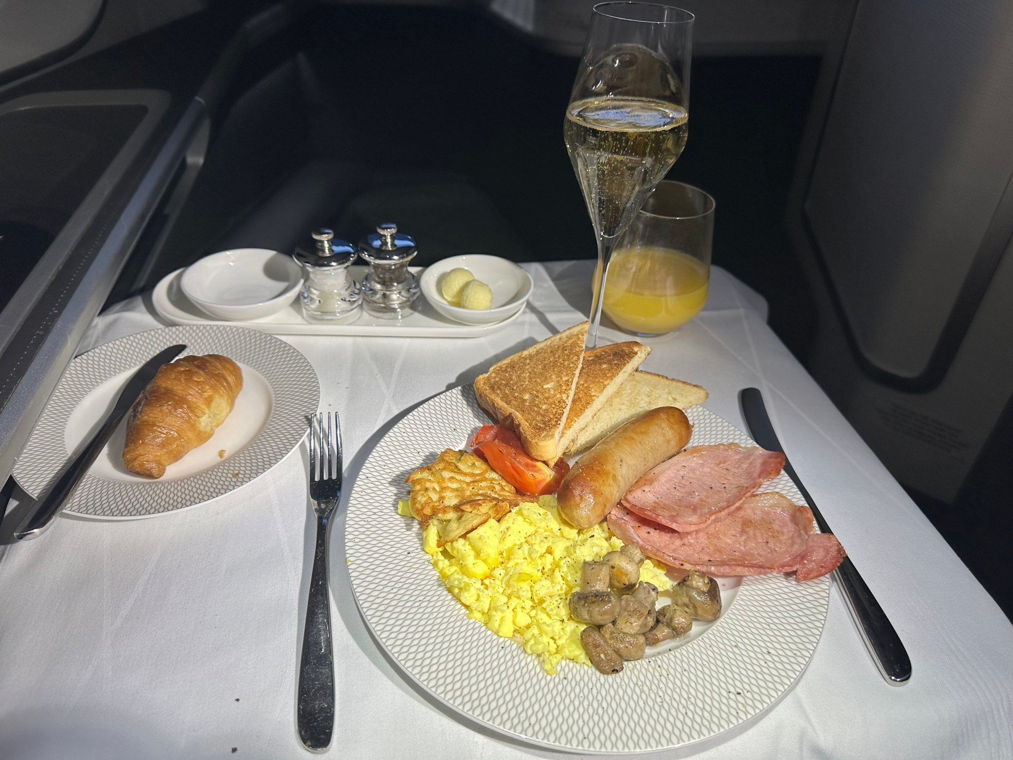 After dinner I was preparing to take.a wander down to the back of the plane when the seatbelt sign was illuminated and we had a few bumpy minutes. As soon as the sign was off I wandered off to the back to have a chat with everyone and then slowly made my way forward again. Between chatting, snoozing, and watching the Equalizer 3 the flight went really quickly and soon it was breakfast time