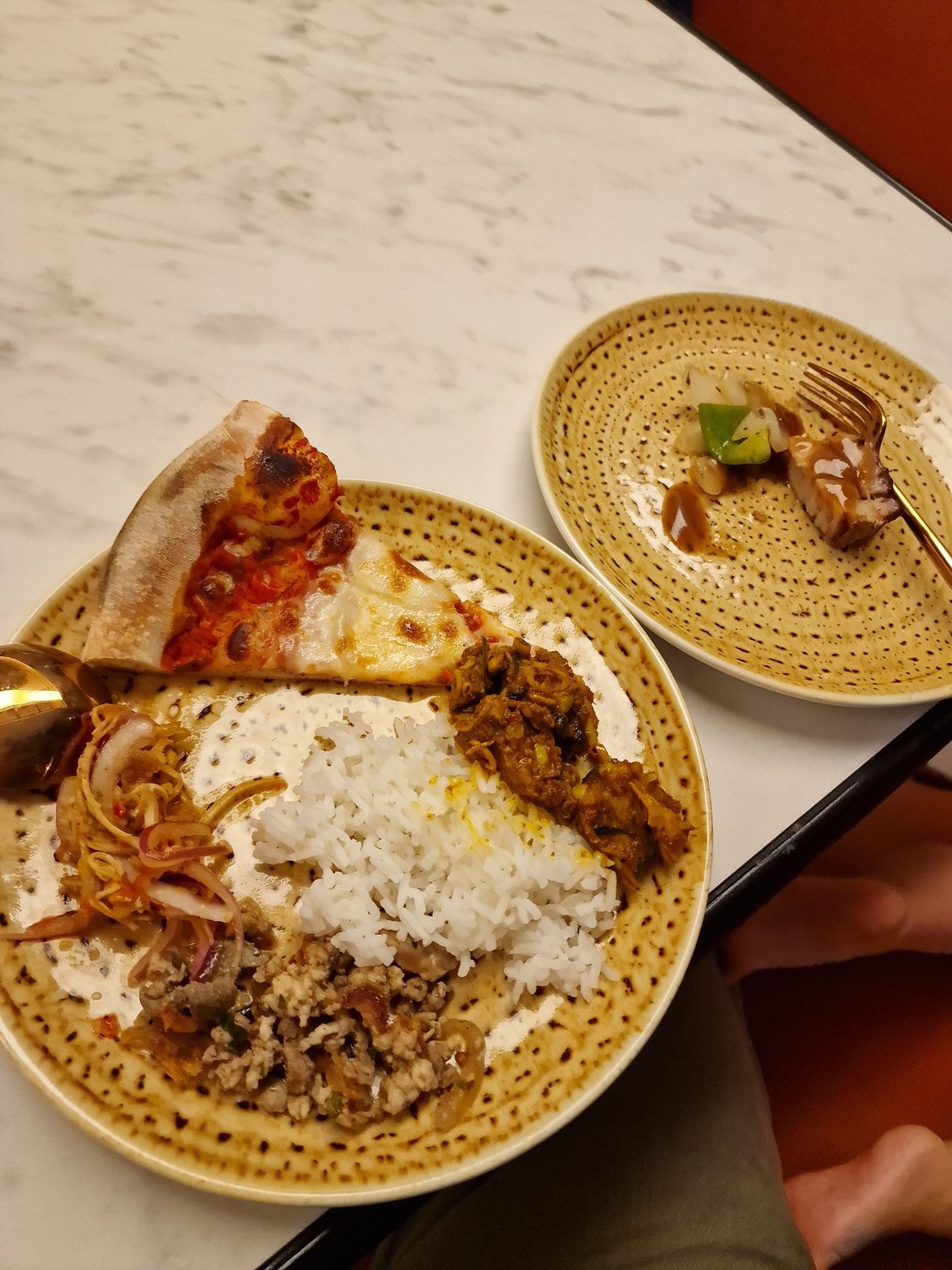 Several hot dishes Western, Asian and Northern Thai including seafood, Pizza, pork roast and also a dessert buffet. Drinks are softdrinks/tea/coffee, white/red wine, several beer brands and cocktails, including a cocktail of the day. All in all a very good offer!