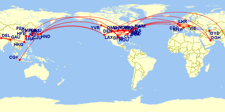 Map is a bit hard to read: GMP HND NRT ORD OMA DEN CLT DCA IAD LHR VIE LAX MDW HOU DFW JFK DEL GAU HKG PEK HFE SHA CJU MXP LGA CJJ AVP IND PWM CGK DOH GYD PHL CDG YVR LNK ICN
