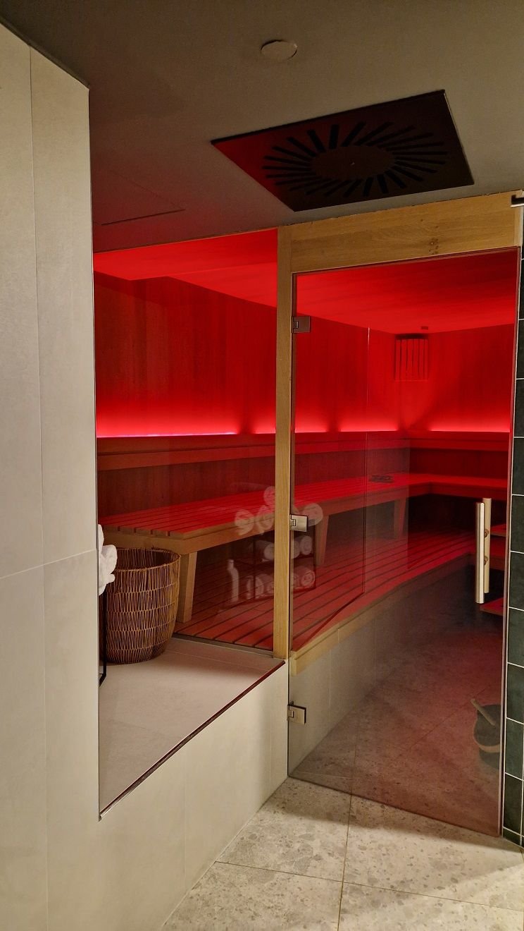 The hotel sauna itself. The red light is just LEDs, it's not infrared light. The next morning the light was green but "there was a naked guest behind the window. I gave up on the idea of taking pictures."