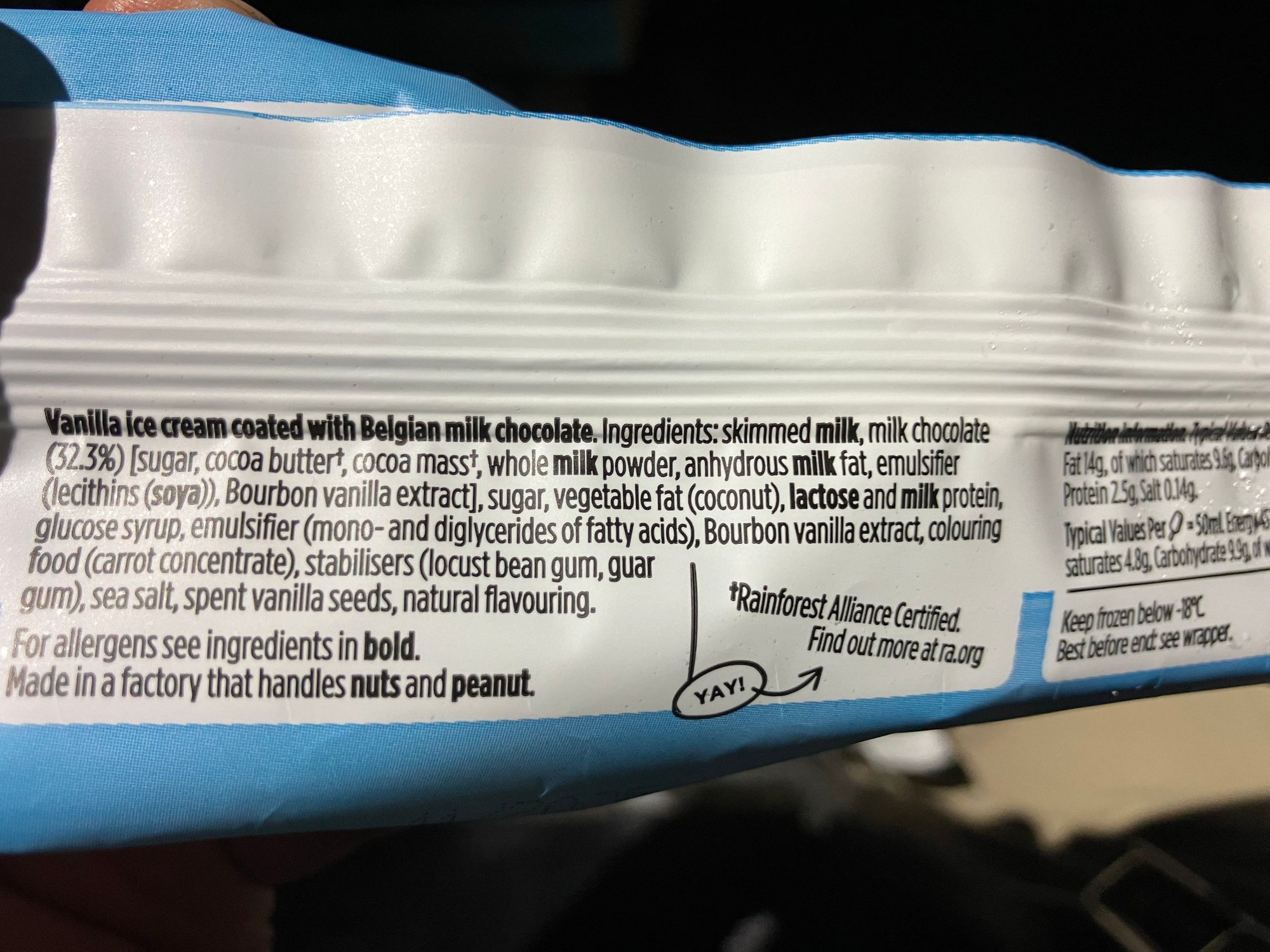 Jude’s ice cream bar /choc-ice for mid flight snack: nice idea. Not as solid an ice cream as Hagen Dazs (has more air whipped into it, and some added ingredients as well as milk and cream and vanilla) but a nice thing to provide in WT+. Do WT get it too?