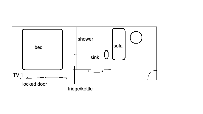 There is a fridge and a tiny alcove which barely fits the kettle. The bathroom is adequate. There is a tiny round table but no desk. Soft and firm pillows are provided, but there is nowhere to put the pillows you don’t want. Several sockets and USB outlets.