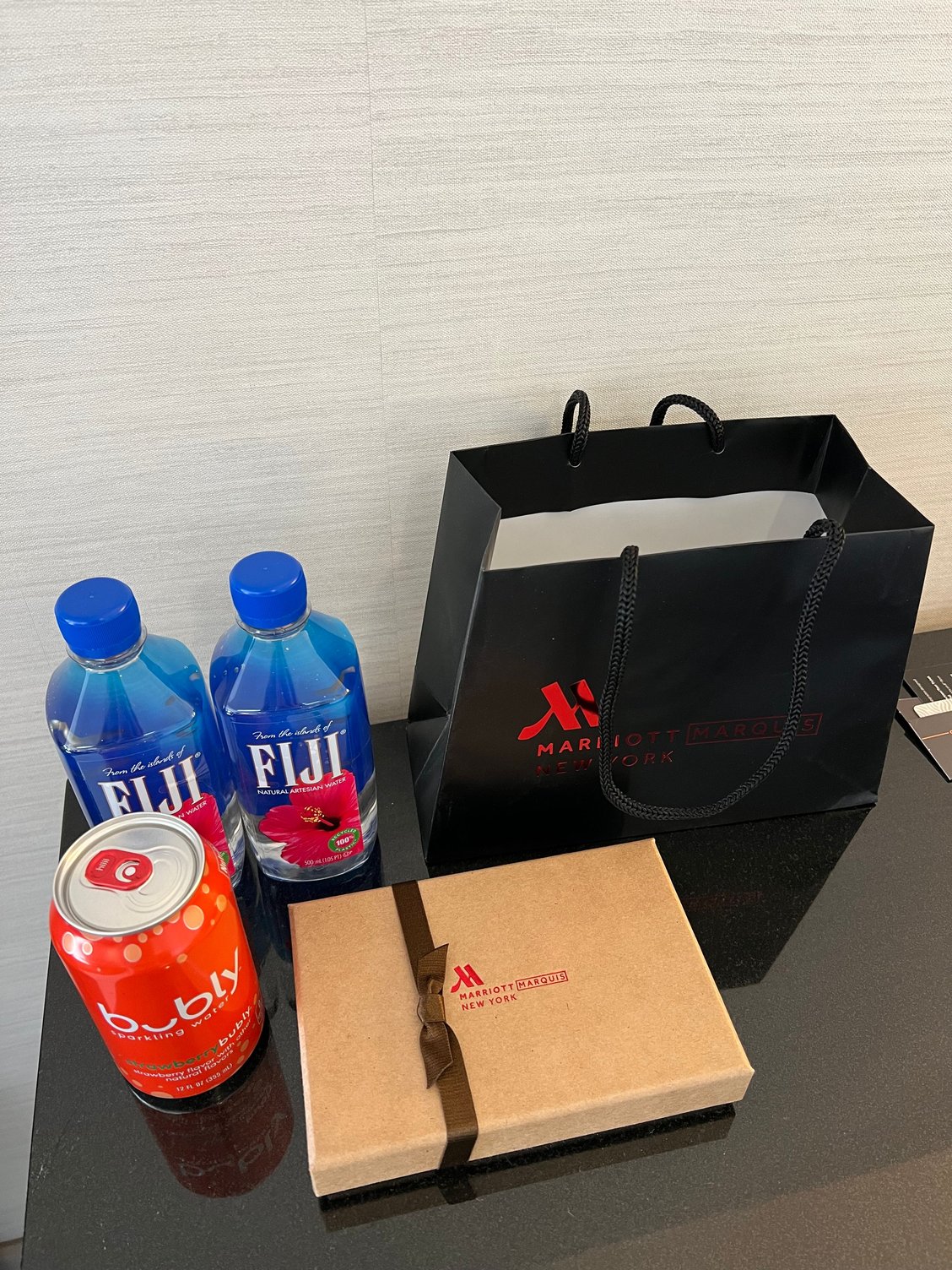 New York Marriott Marquis - they asked at check-in if I drank alcohol, I told them no, and instead got the non-alcoholic bag, which was Fiji water, strawberry sparkling water, and a cracker, nut, and cheese box.