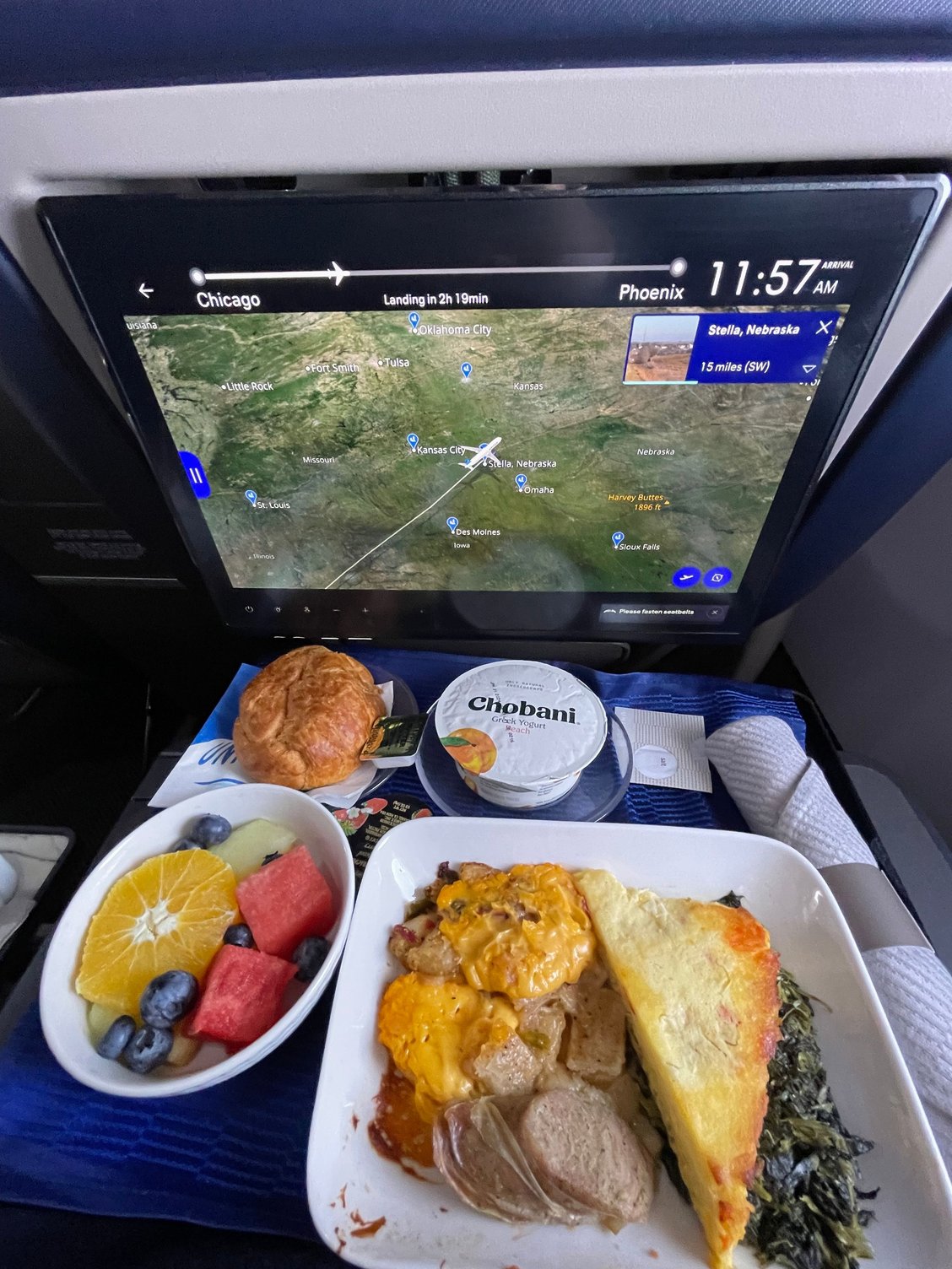 The pitch is tight when person in front reclines. The person in front of me in 3F had some trouble reclining so the purser sat down and reclined the seat, which is where it stayed the entire flight including the meal service which was a bit irritating. With that seat all the way back, and placing meal square on the tray, the monitor was touching food on the tray. So either hope nobody reclines during the meal or don’t try to use the monitor in the process (don’t swivel it up).