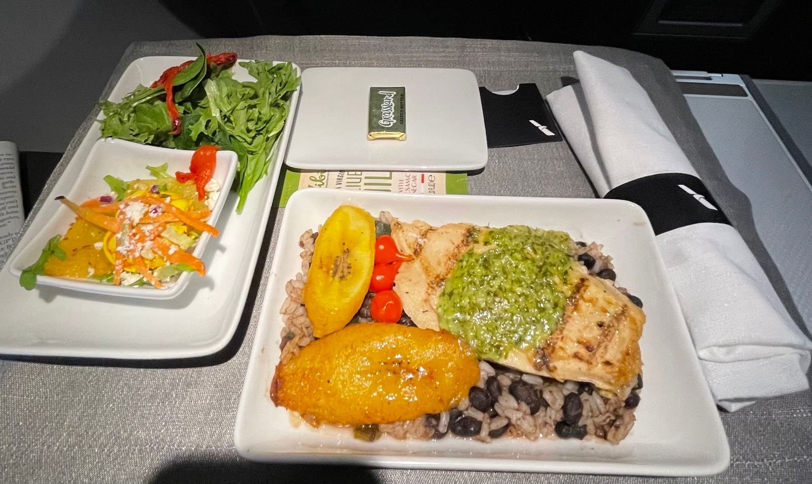 This main was really good. Perhaps the best AA main I've had from a US kitchen (I think it beats the miso sea bass, my prior favorite.) Execution was good too and everything was warmed very well (avoided multiple potential points of failures) - the chicken was not dry for being breast, the rice & beans were great (rice not crispy, beans not dry.) Seemed relatively healthy too. AA should replace the always-available "golden chicken" with this