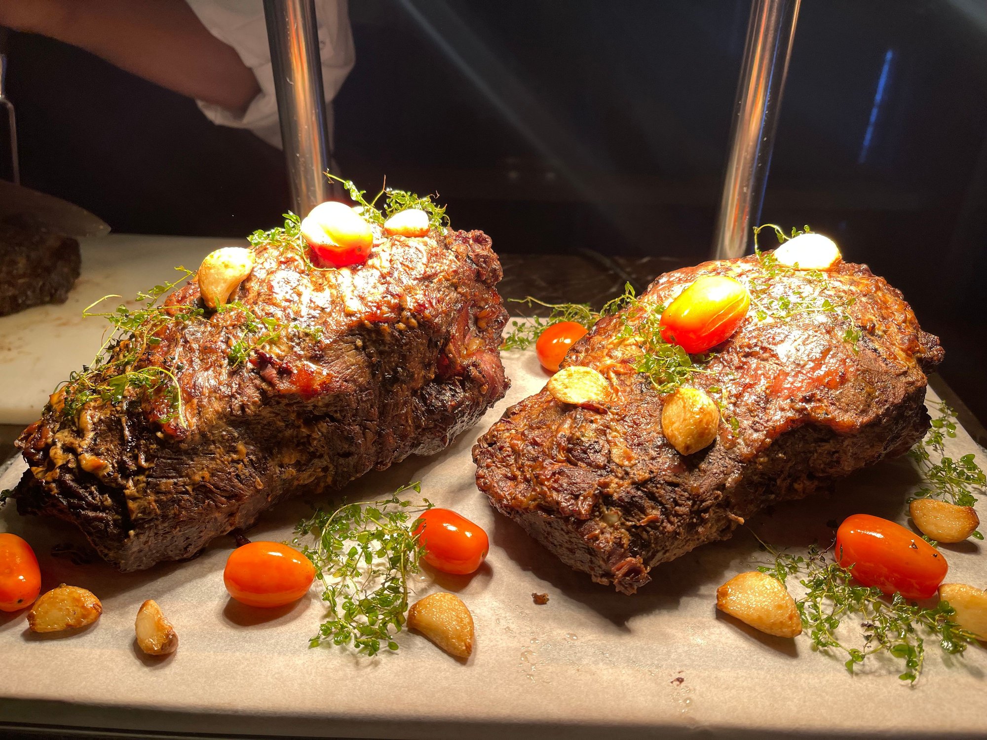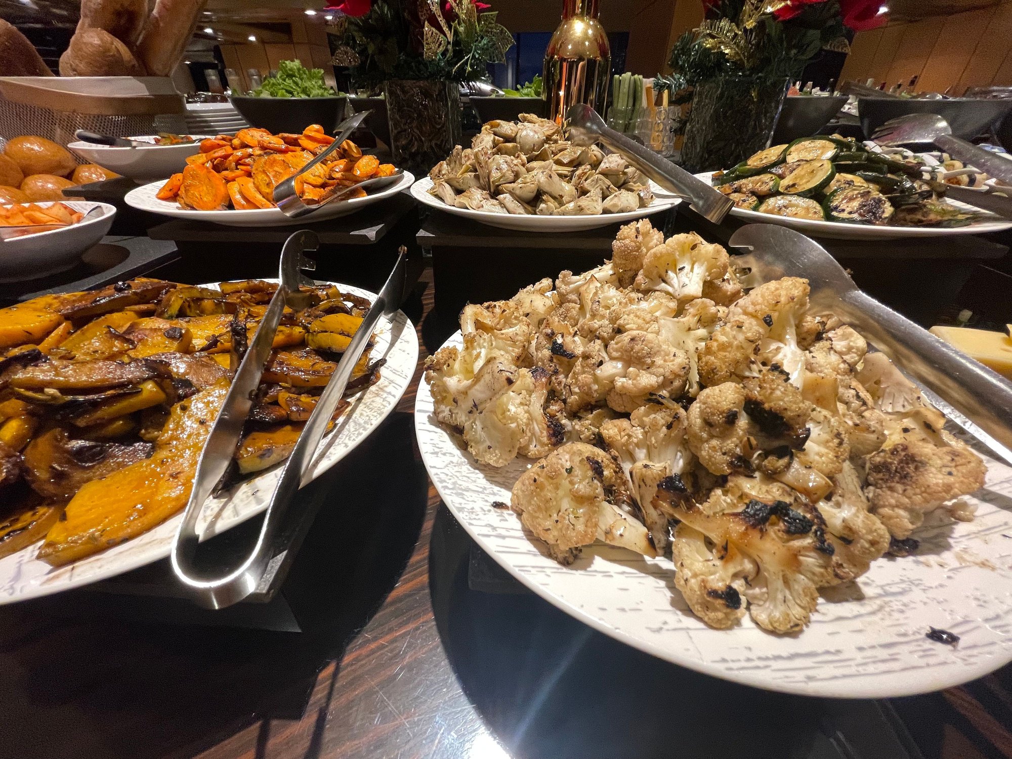So it was a surprise and delight to not only encounter a roast beef carving station, but to see such choices as: gindara in marinara sauce, fried duck in orange, and beef rendang. Lots of hot sides as well, like sautéed carrot and stringbean and Javanese fried rice. The best plant-based treat, however, was from the cold section of the buffet where a blitzed-to-heaven charred cauliflower was feautured alongside pumpkin and other harvest-season veggies.