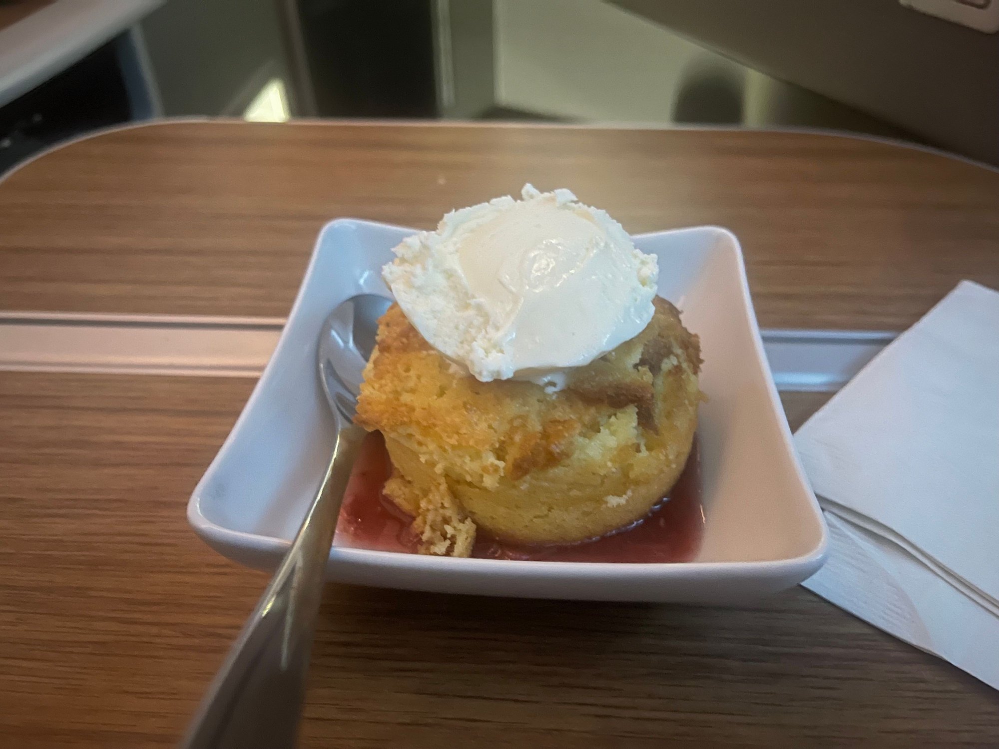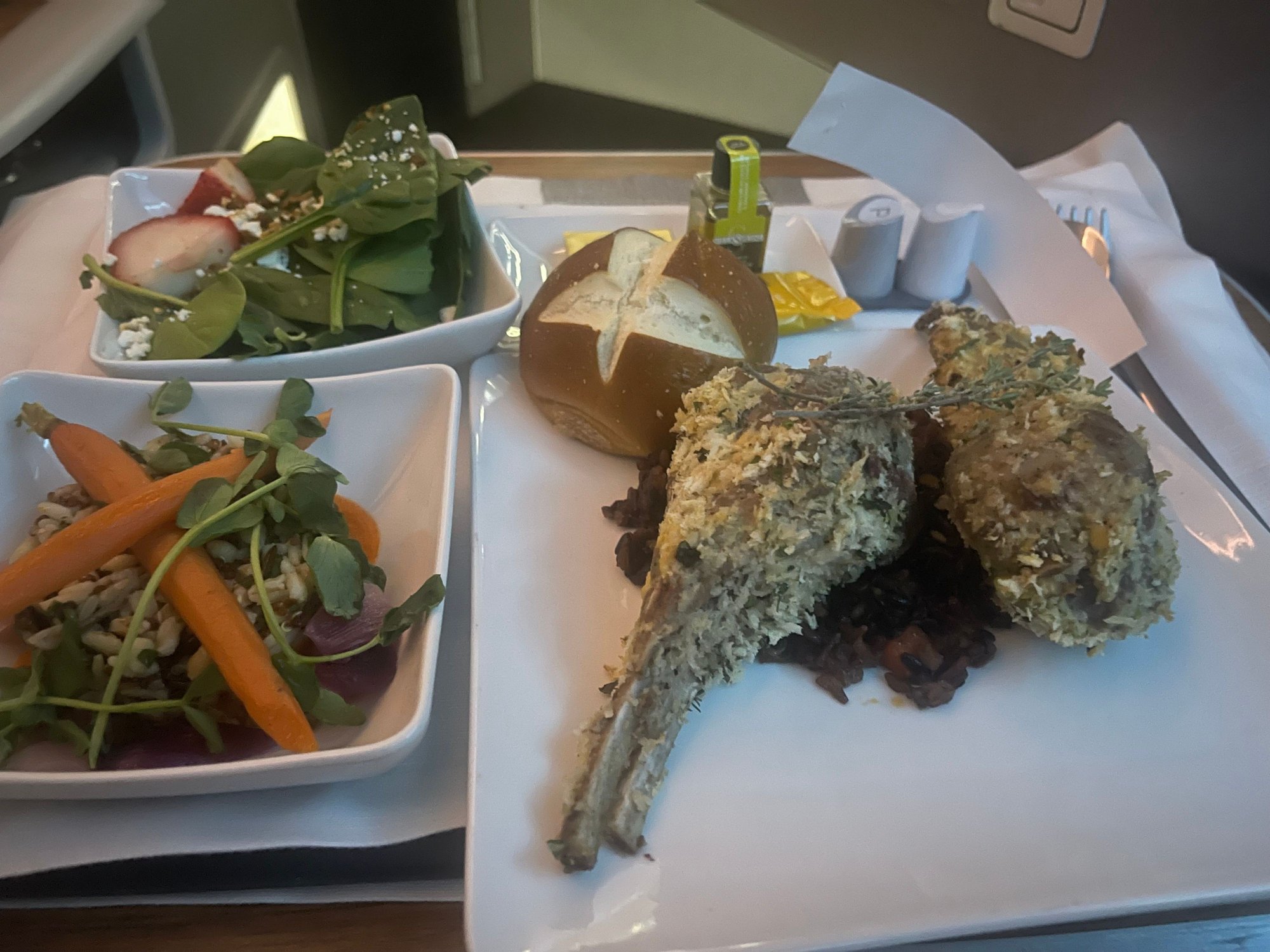 Hot towel, nut/olives, and the one-tray app/main. Pre-ordered the lamb cutlets which were tasty enough albeit a little fatty. Won’t make anyone forget the BA F lamb shank.