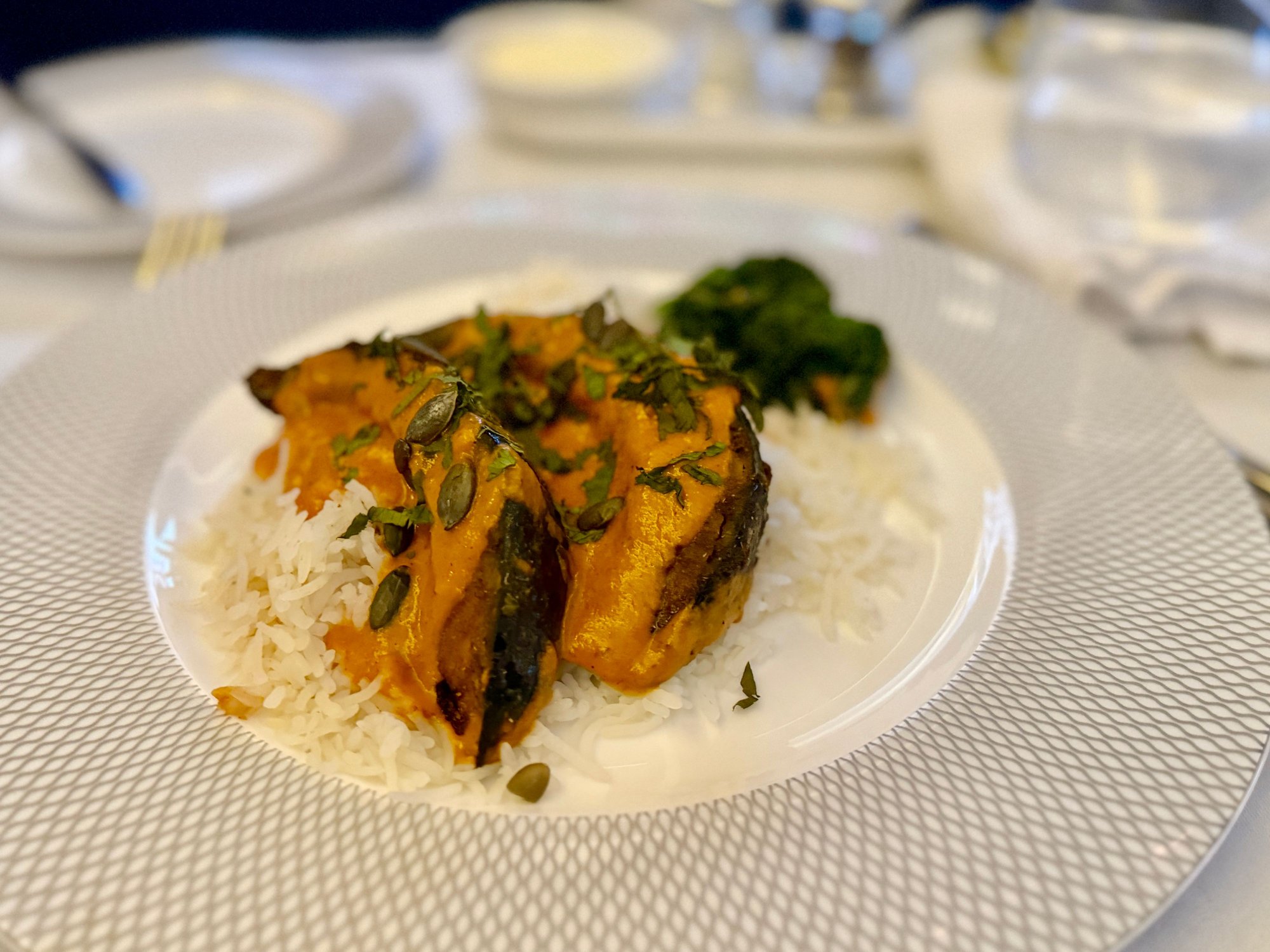 Curry squash on rice, tasty! Main meal in F out of LHR