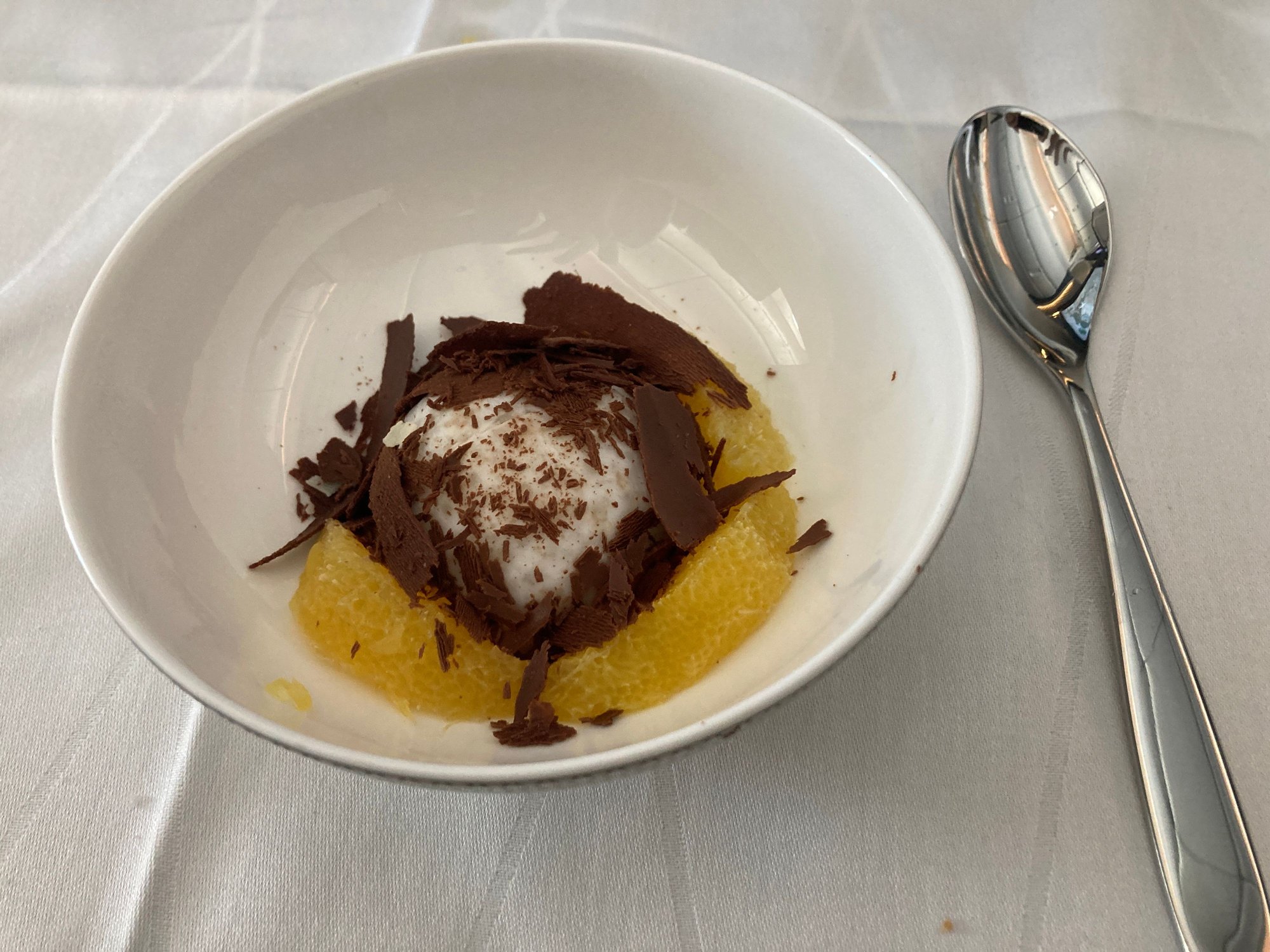 Crew had been playing guessing games at what the white lump. It was a coconut and rice pudding (cold) with chocolate shavings and orange slices. Not bad, my wife enjoyed it more than me but I found centre of mine a little too wet and watery in the mouth but oddly not on the plate. Pretty good though.