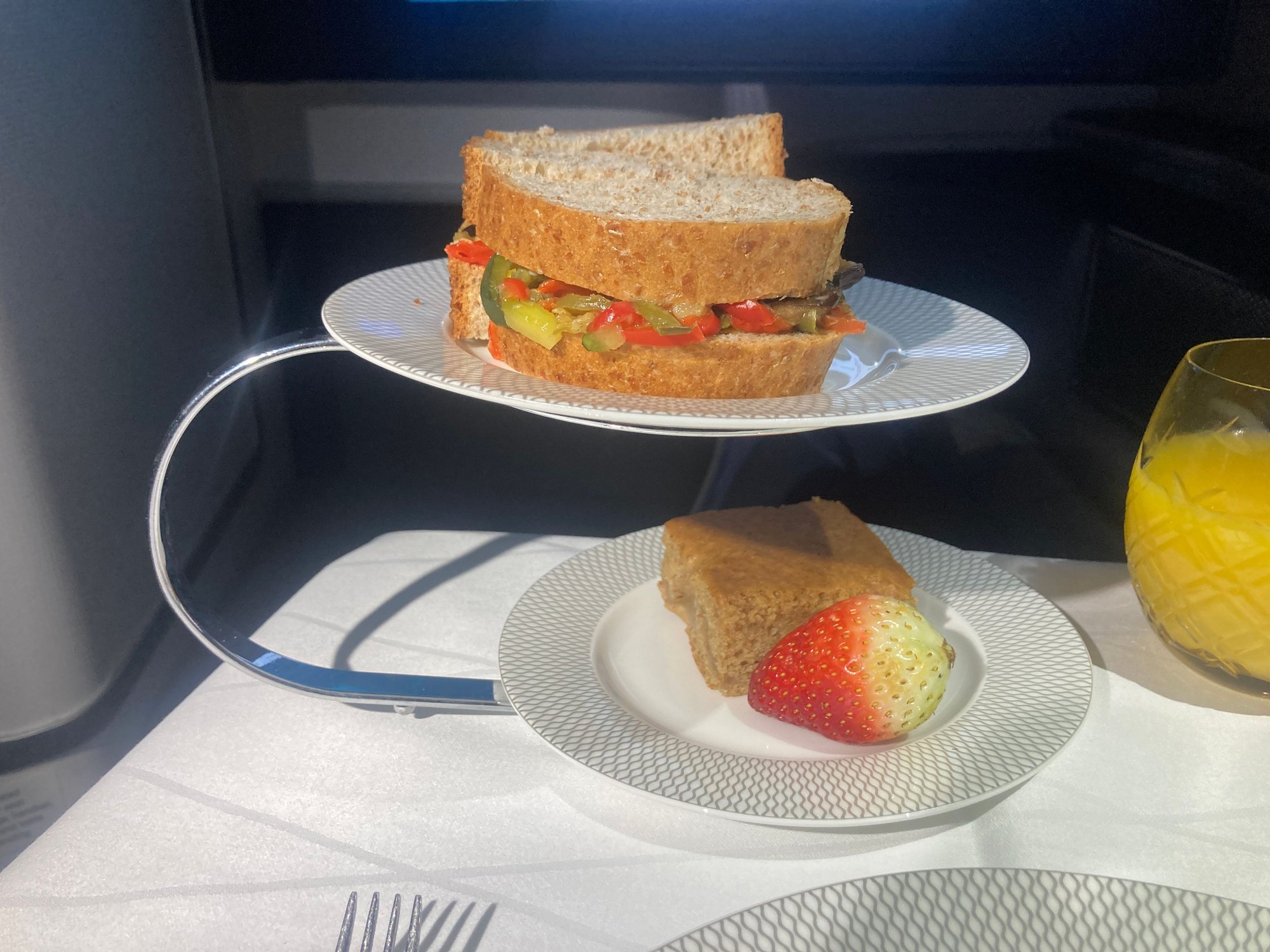 And we finish with an ex-DXB afternoon tea. Mixed vegetable sandwich cut into thirds, one strawberry and a cake. Sandwich was what you’d expect from wet vegetables in bread. Strawberry would not win Wimbledon. Cake pretty good school dinner food (which isn’t a bad thing).