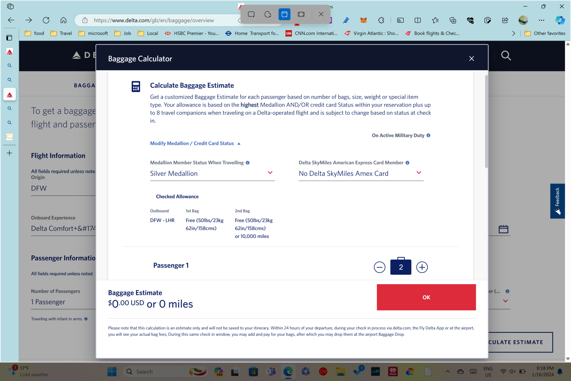 Never had this issue before with the app but am travelling DFW-JFK-LHR all on one ticket having Virgin Silver (shows as Silver Medallion in the app/Skyteam Elite) and usually I always get 2 bags for free (this happened correctly on my outbound journey even in Comfort Plus) and this is my return journey. The app is wanting to charge me $100 when I put in the number of bags so just wondered if this is some new bug that has developed? The only thing I can think of is the JFK-LHR is on VS and everything was purchased through VS so the boarding pass displayed lists the VS flight numbers on each pass and not the DL ones.