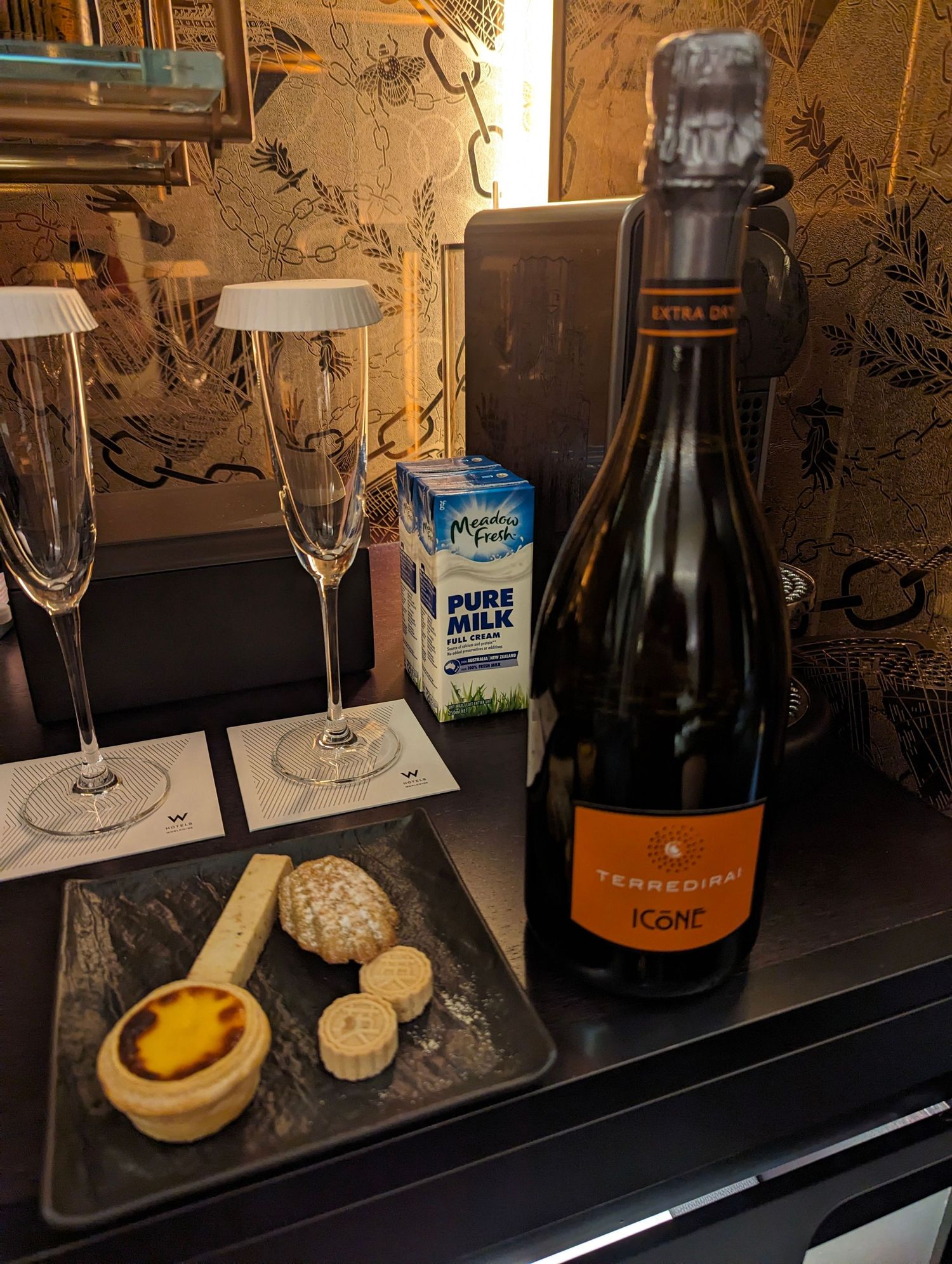 Received this tray of desserts, including a local specialty of an egg tart, and a bottle of wine at the W Macau. I didn't drink the wine as I was only there for one night and can't drink that much.