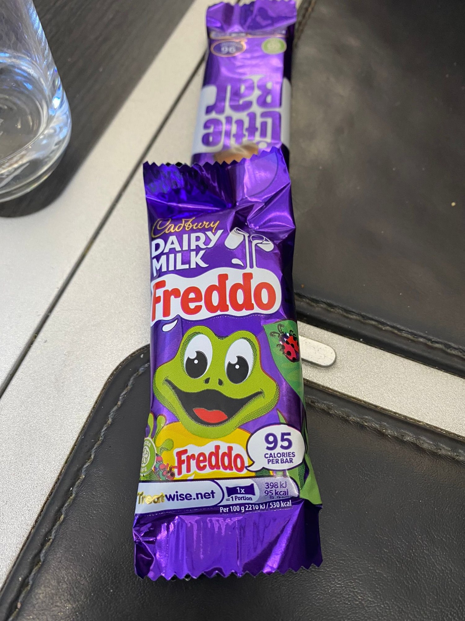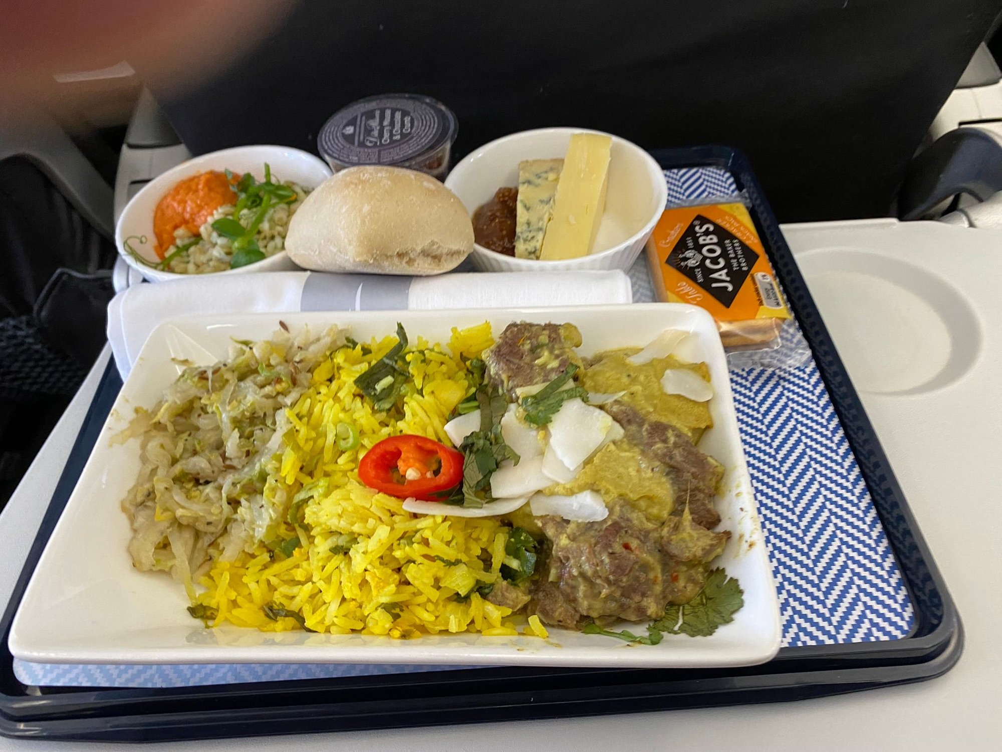 CE row 5. No menus. Choices were Indonesian beef curry (OH had that, it was yummy), veg cottage pie (no comment) and Coronation chicken salad (which I had). Salad fine but not exceptional. I liked the wheat/pesto combo side dish & ate OH’s too. Dessert yukky IMHO. OH had my cheese, bread & biscuits and said it was like cheese, bread & biscuits!