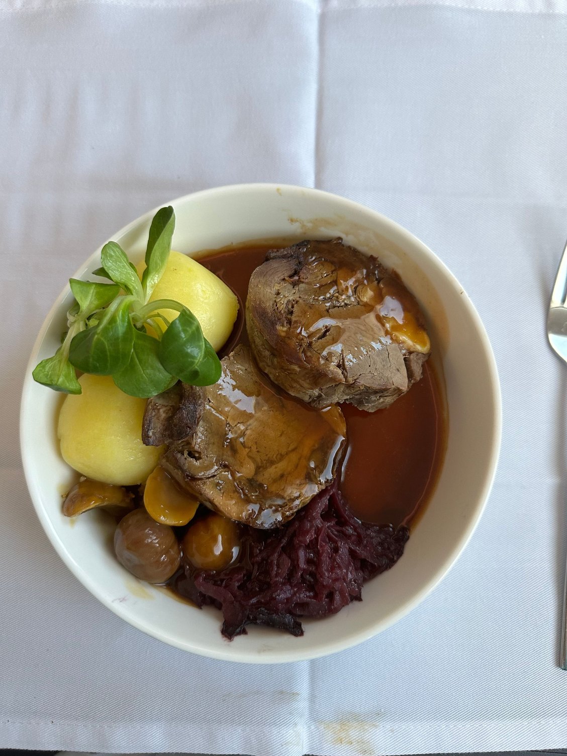 herb and wine reduction, potato dumplings, braised cabbage, chestnuts
