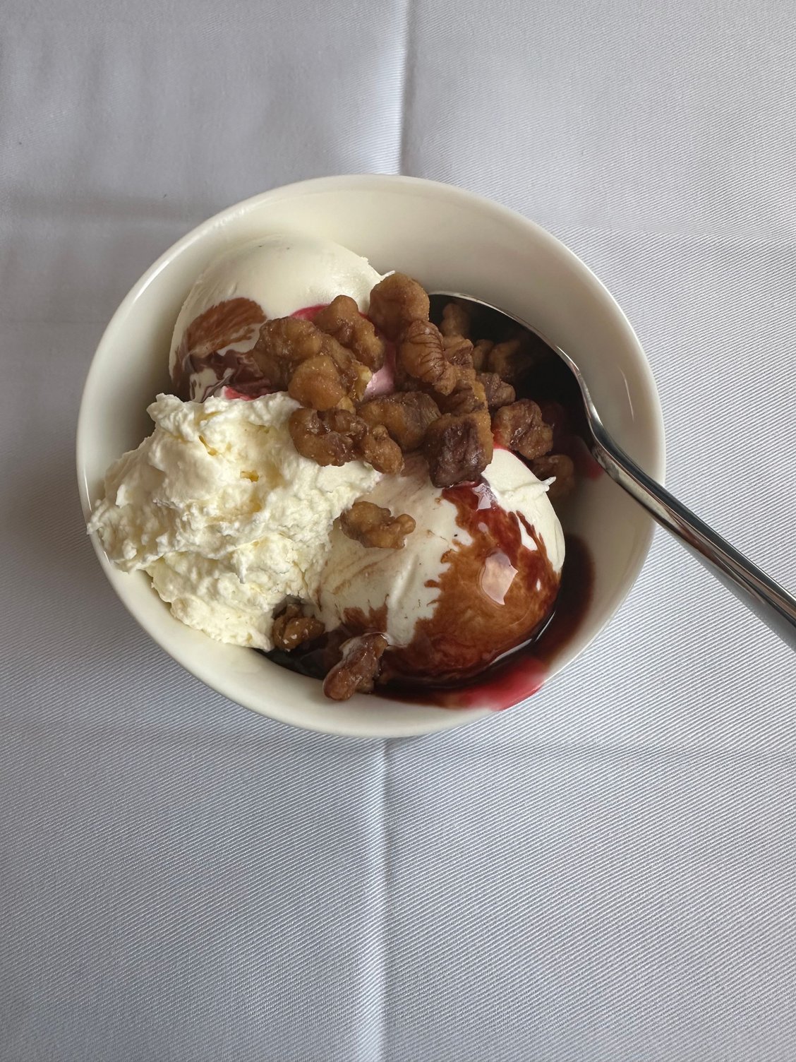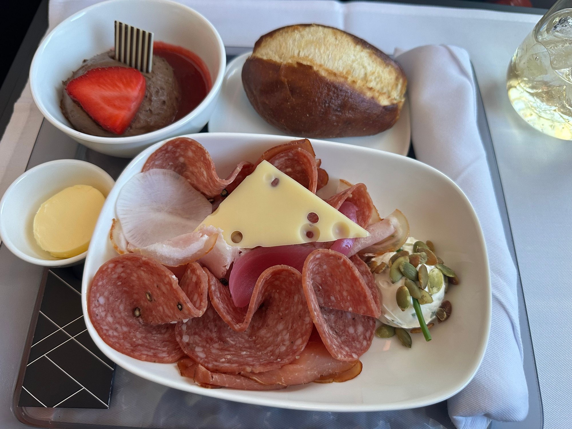 Tyrolean ham, cooked ham, pepper salami, Emmental cheese, cream cheese and herbs, pickled onions, radishes, pumpkin seeds. Served with bread, butter, chocolate mousse.
