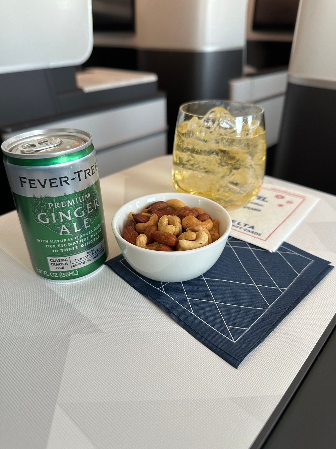 Usual PDB of OJ or Prosecco (FA - correctly - did not call it champagne!), then hot towel, nuts + drinks. Flight attendant on my aisle proactively gave me a second mini can of ginger ale with the full glass: