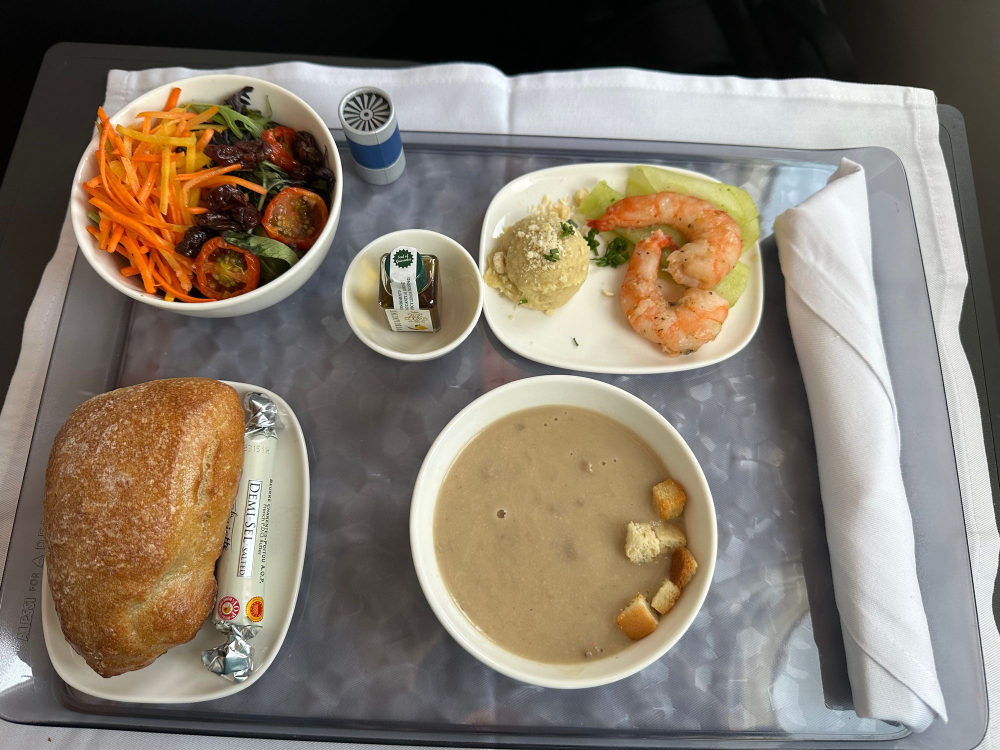 Soup and prawns were meh, bread roll was very large, salad was decent but the spicy lemon dressing a little odd