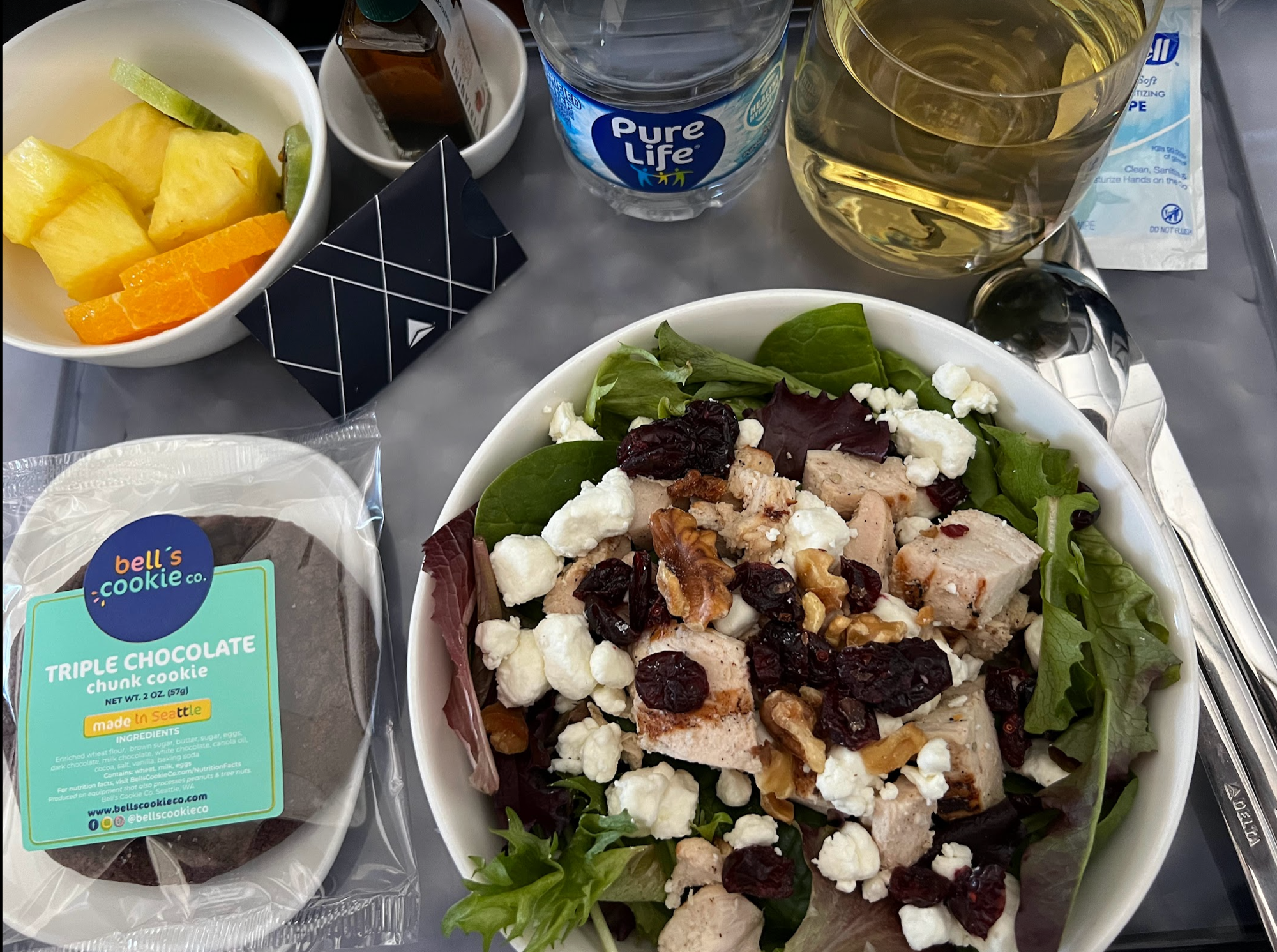 Menu posted above, went with the grilled chicken salad. It was very good, the chicken was some of the best airplane chicken I've had (good chunks of chicken breast that was well cooked and not rubbery in the least). The dressing has a nice spice to it, some may not like it but as a spice fan no issues on my end. I would have loved a little more crunch on the salad (either more walnuts or some crackers or bread on the side that I could have used). Overall a tasty and fairly healthy F meal coupled with a very good set of FAs working the front
