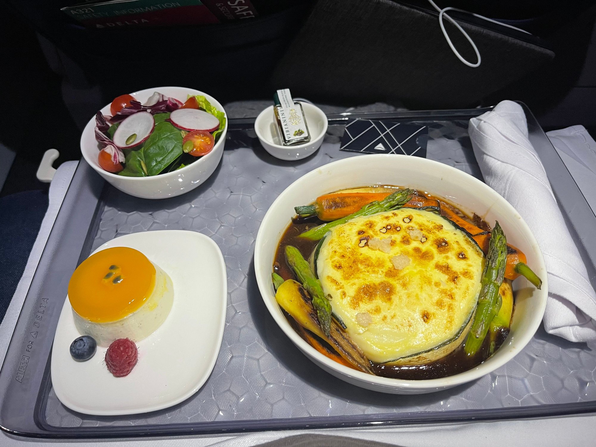 It was actually quite tasty. The salad was just OK. The FA told the pax in front of me that the passion fruit panna cotta was a cheesecake when he asked if it had gluten 🙄 (I liked it very much!)
